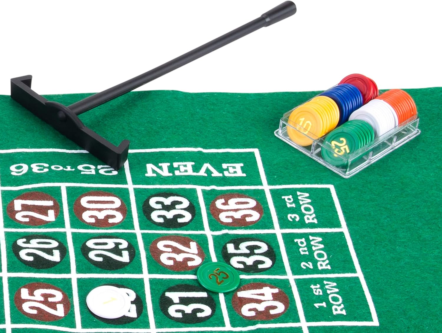 - Beinhaltet: Roulette, Wendematte, Dealer Rake, Spielchips, 2 Decks, 2 Roulettebälle, Spielregeln