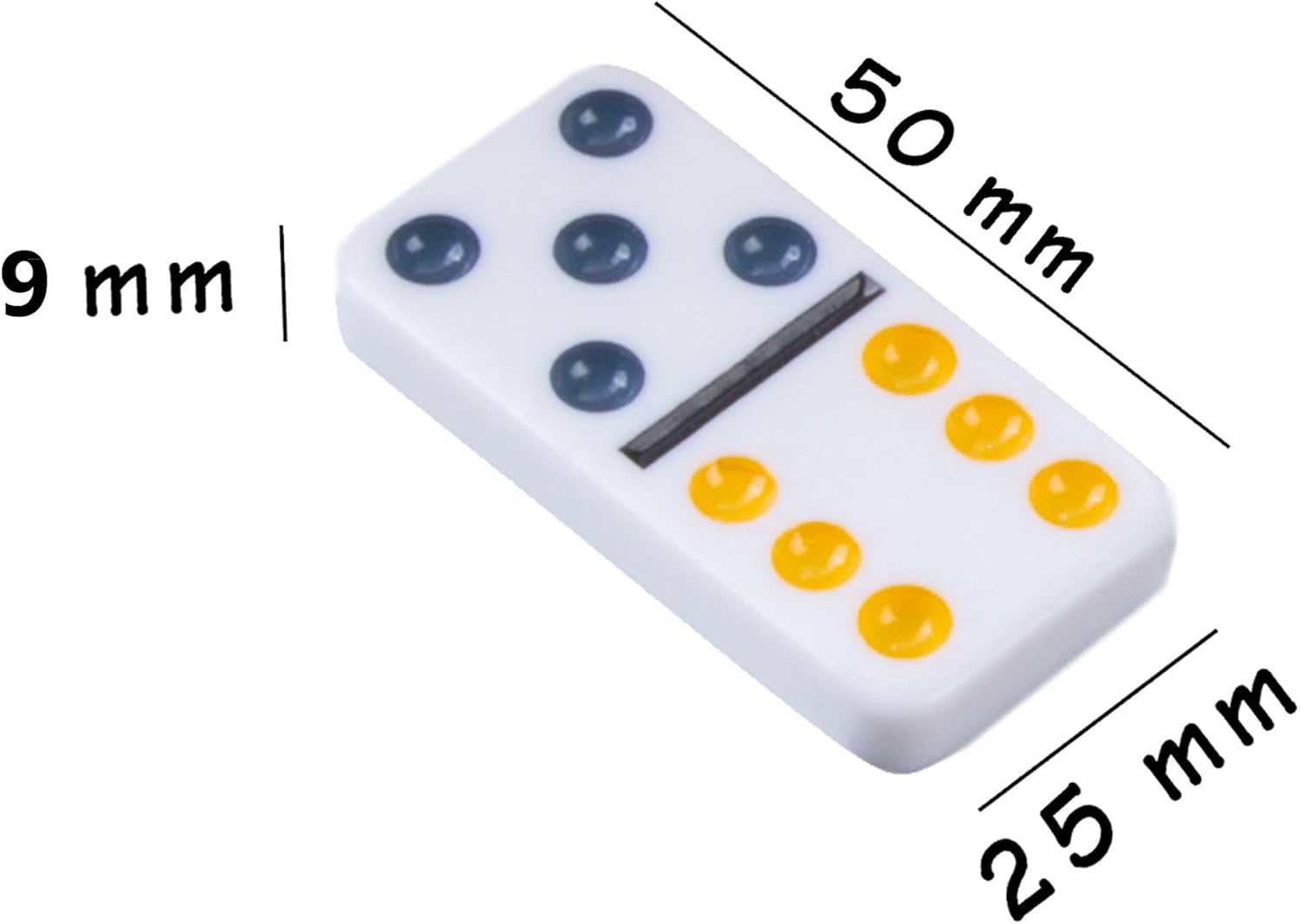 - Die Grösse eines Dominos ist 9mm dick, 25 mm breit, 50 mm lang. Die Box enthält: 91 Dominosteine, Spielregeln. Ab 3 Jahren