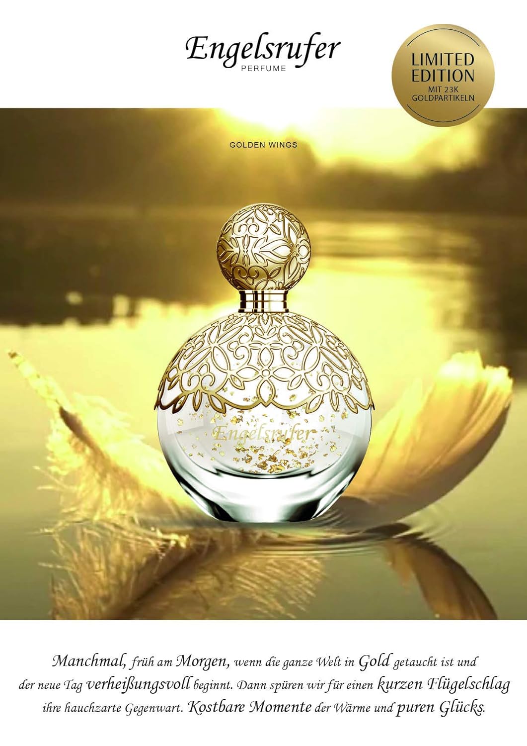 - INSPIRATION: Golden Wings ist inspiriert von der Schönheit des Sonnenaufgangs, der sich strahlend über die Welt erhebt und sie in goldenes Licht taucht. Das einmalige Zusammenspiel des edlen, filigranen Goldgitters mit den echten 24K Goldpartikeln im