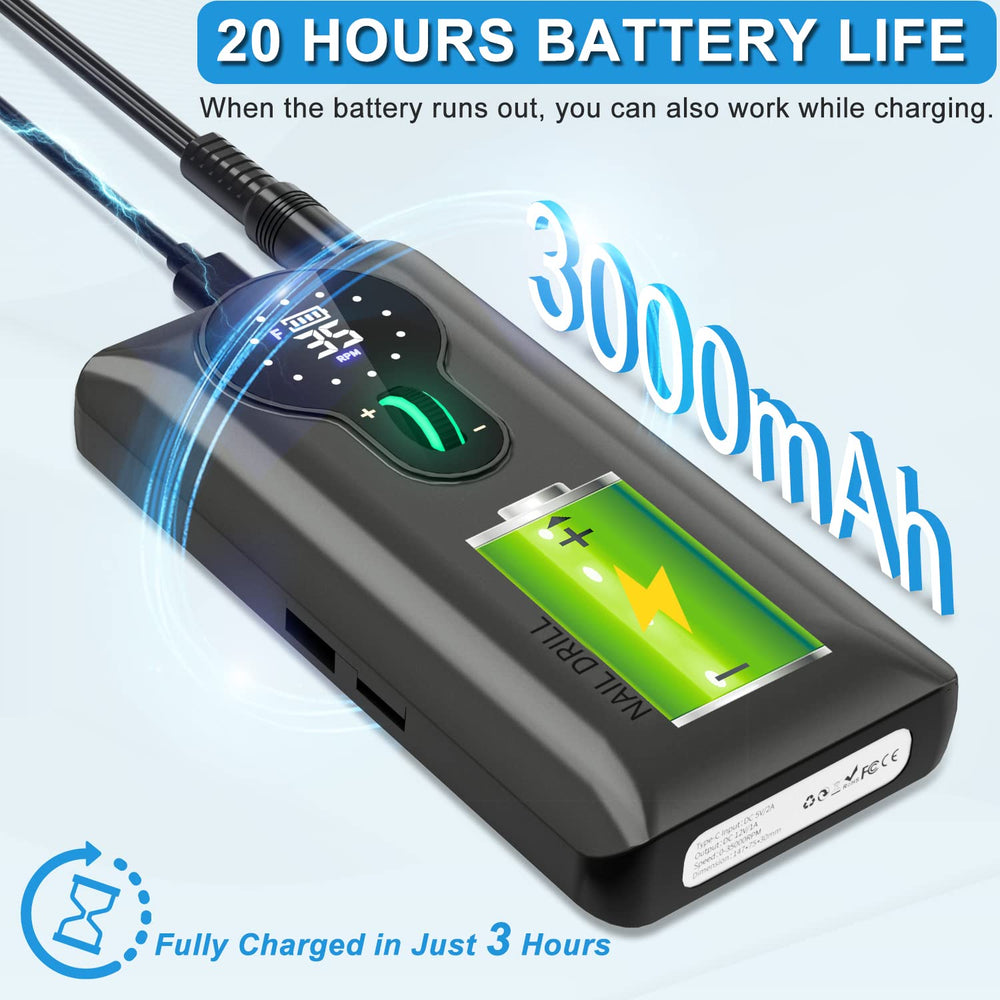 - 【15+ Stunden Akkulaufzeit bei 35000 RPM】: Achten Sie darauf, die Schutzfolie nach Erhalt vom Bildschirm zu entfernen. Arbeiten Sie nach dem vollständigen Aufladen über 20 STUNDEN ununterbrochen im Standardmodus und über 15 STUNDEN bei 35000 U/min. Ermöglicht jede Maniküre/Pediküre/Shaping/Carving/Polishing (Einzigartiger Vorteil: Wenn die Maniküre nicht durchgeführt wurde, bevor der Akku leer ist, unterstützt er die Arbeit während des Ladevorgangs ).
