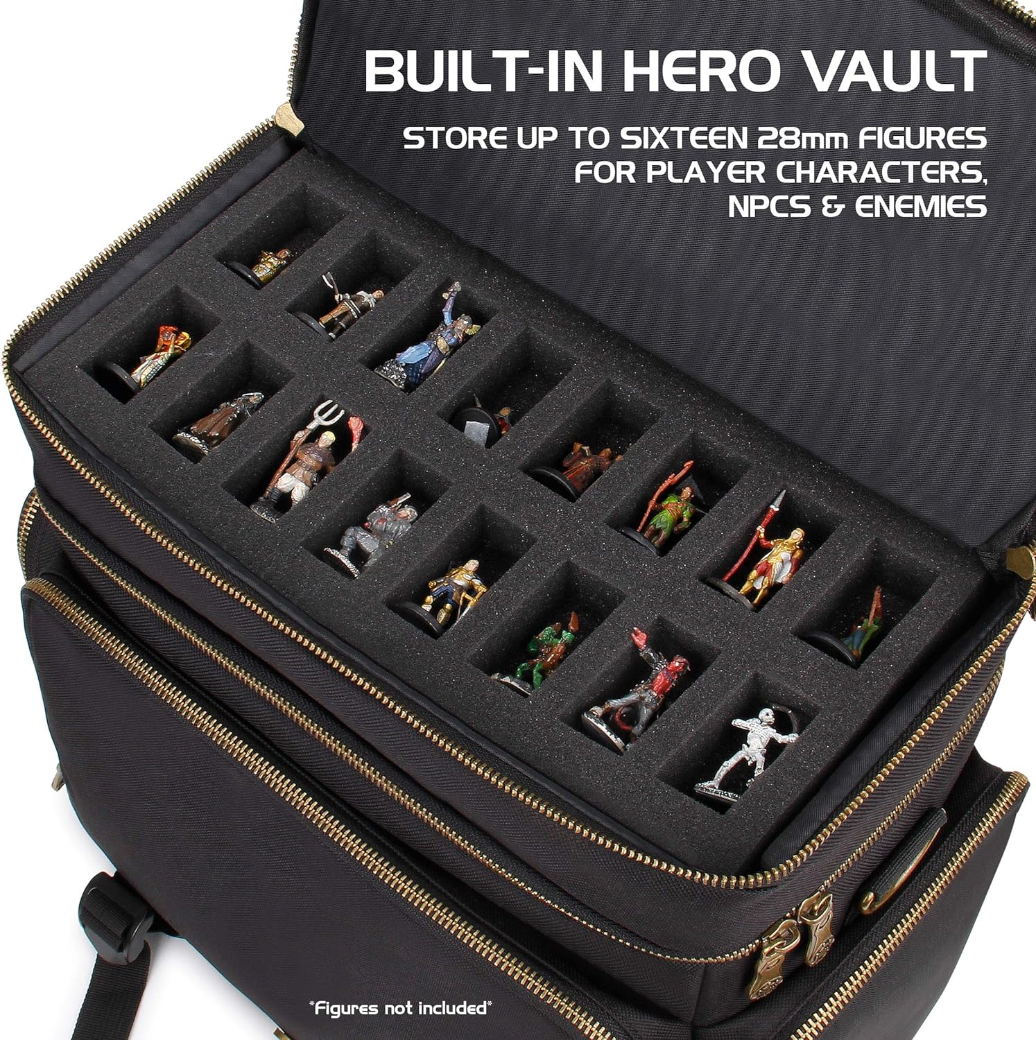 - Charaktere Ziehen AUS IHRER TASCHE: Das obere Fach verfügt über einen 16-teiligen Schaumstoff-Aufbewahrungsbereich für 28-mm-Figuren, der Ihren PC, NPCs oder die nächsten Gegner der Partei darstellt