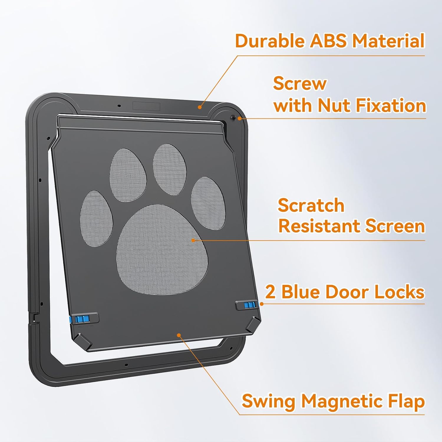 - Magnetisch in die Tür eingebettet, schliesst es sich automatisch, wenn Ihr Hund oder Ihre Katze ein- oder herauskommt. Wenn Sie verhindern möchten, dass Haustiere ausgehen, können Sie die Tür mit einem blauen Schloss verriegeln.