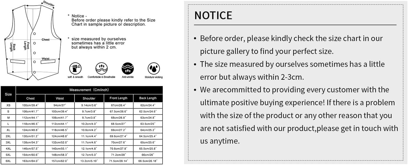 PRODUKTBESCHREIBUNGEN Weste + Krawatte + Einstecktuch Es ist ein Muss für Hochzeitsfeier, Geschäftstreffen und den lässigen Gebrauch. Wir bieten nicht nur Produkte, sondern auch die Verantwortung. Professionelle Ergebnisse in ausgezeichneten. Wenn Sie irgendein Problem haben, zögern Sie nicht, uns zu kontaktieren, wir werden Ihnen einen besten Service bieten. Vielen Dank.