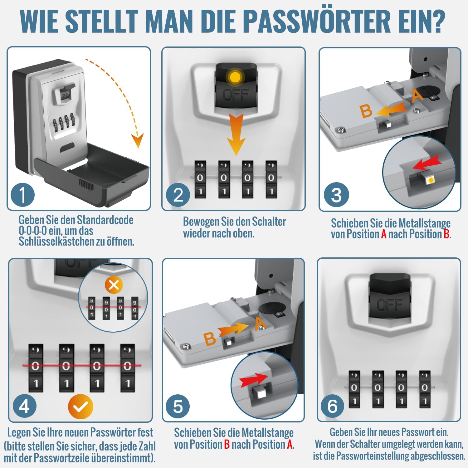 - 🏠【Breites Anwendungsspektrum】Dieser Gross Schlüsselsafe mit Code für Draussen ist rost-, korrosions-und witterungsbeständig, perfekt für den Innen-und Aussenbereich, wie z.B. Häuser, Zäune, Büros, Garagen, Wohnheime, Turnhallen,
