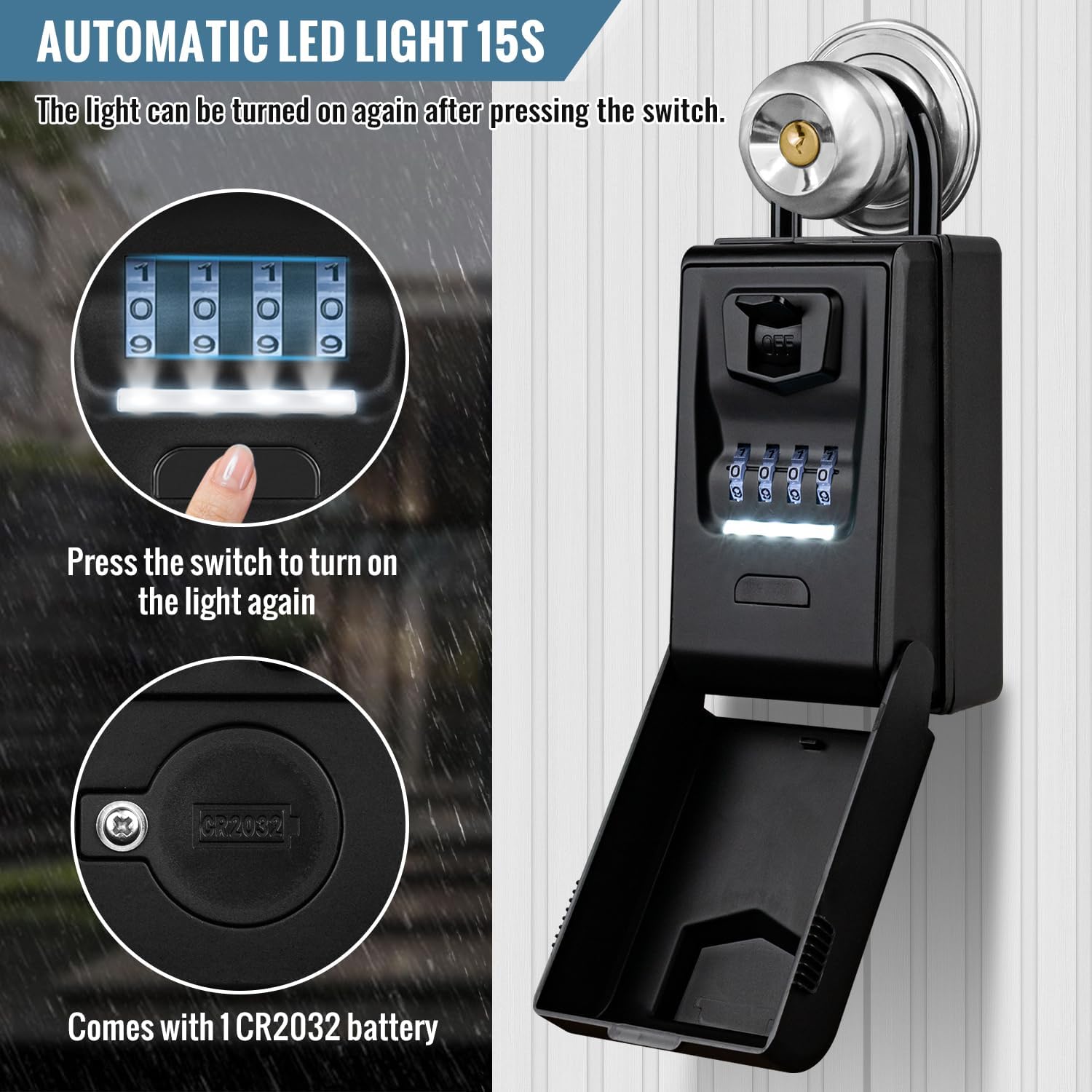• 🏠【Schlüsseltresor mit Beleuchteten Zahlencode】Das Schlüsseltresor mit Bügel Aussen ist mit einer grossen, klaren, selbstleuchtenden Zifferntastatur ausgestattet, über die Sie Ihre PIN auch im Dunkeln schnell und präzise eingeben können.