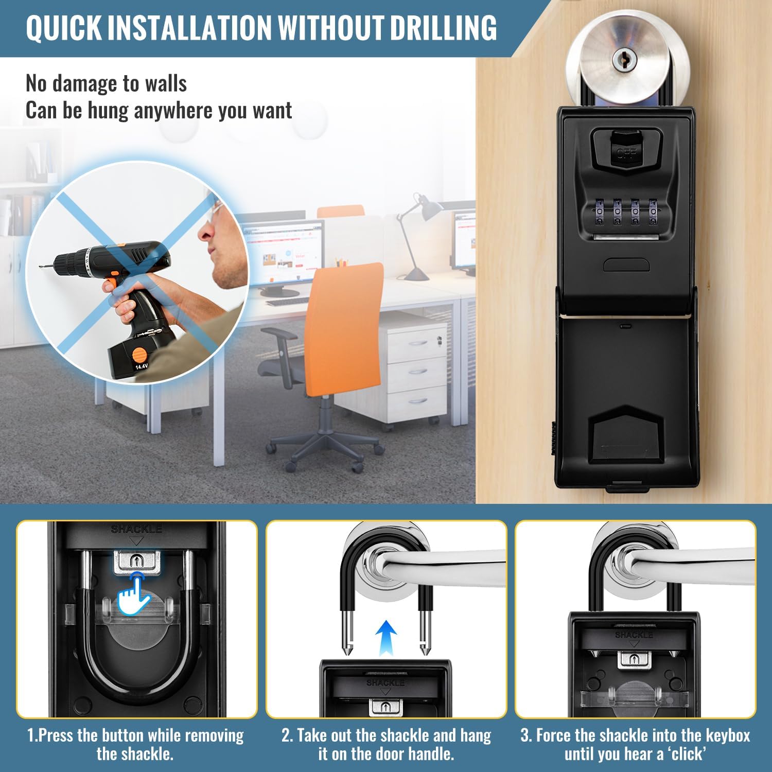 • 🏠【Einfache Installation, ohne Bohren】Der Schlüsselbox mit Zahlenschloss Tragbarer erfordert kein Bohren und kann einfach an einen Türgriff oder ein Metallgitter gehängt werden, um Schäden an der Wand zu vermeiden. Der Anfangscode für den
