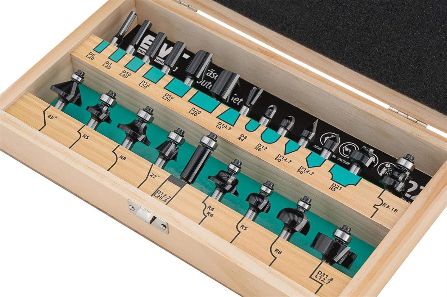 - 22 tlg. Fräser-Set - 6x Nutfräser - 1x Viertelstabfräser - 1x Bündigfräser mit KL - 2x Abrundfräser mit KL - 2x Hohlkehlfräser - 2x Hohlkehlfräser mit KL - 1x Gratfräser - 2x V-Nutfräser, Winkel 60/90° - 1x Profilfräser römisch - 2x