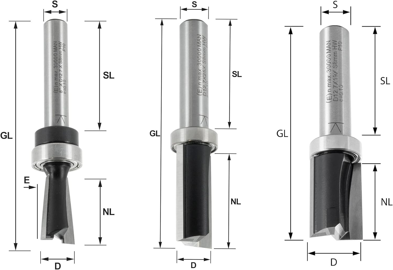- ENT Bündigfräser (1): Durchmesser (D): 12,7 mm / Nutzlänge (NL): 19 mm / Schneiden (Z): 2 + 1 (mit Bohrschneide) / Schaft (S): 8 mm / Schaftlänge (SL): 32 mm / Gesamtlänge (GL): 55 mm / Kugellager (KL): 12,7 mm