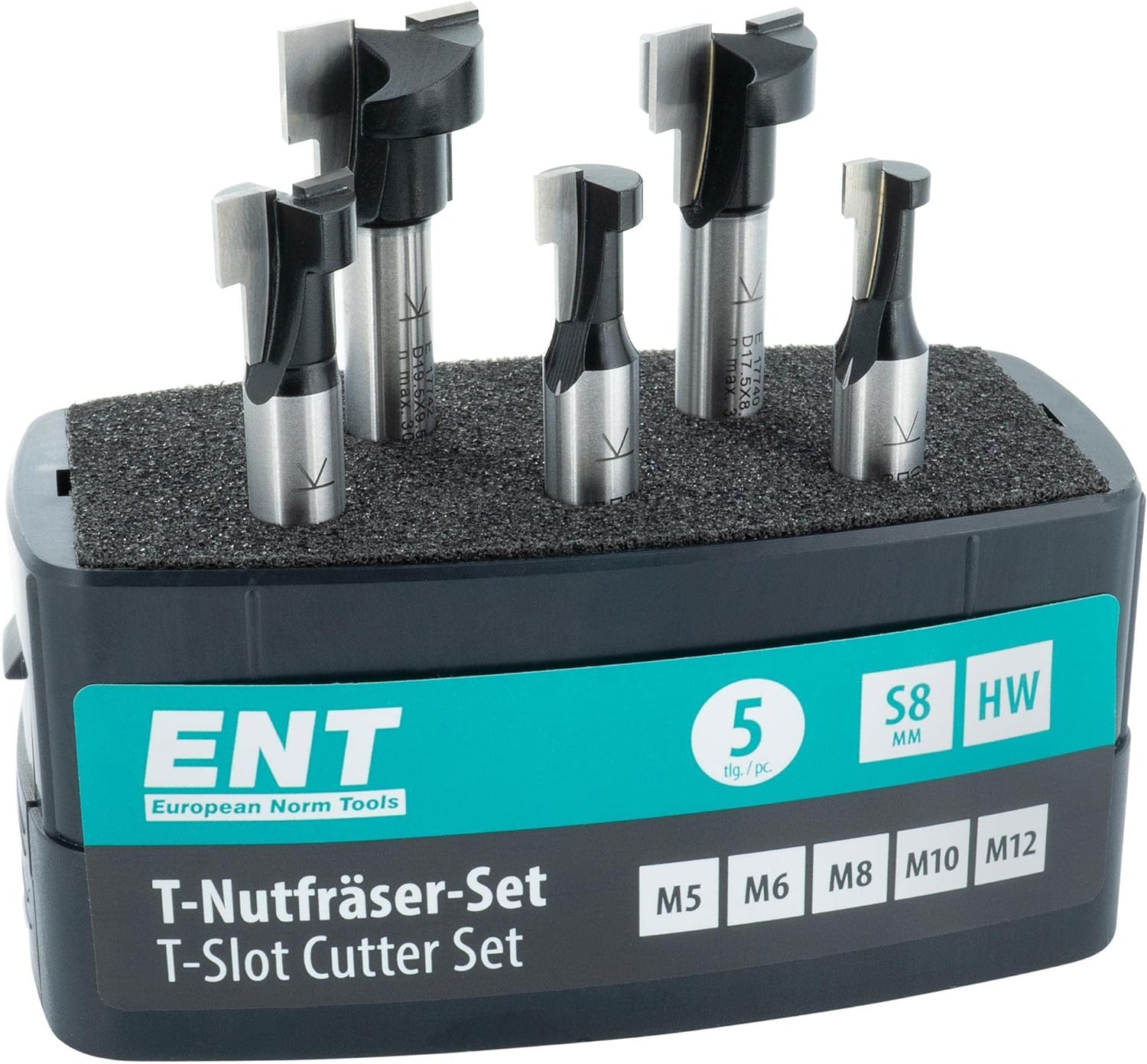 - Fünf T-Nutfräser im Set optimiert für Sechskantschrauben mit metrischem Gewinde M5, M6, M8, M10 und M12. Zum Fräsen von ausrissfreien T-Nutenprofilen, als Alternative zu Alu-Profilschienen.