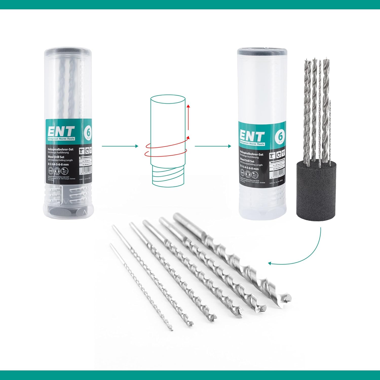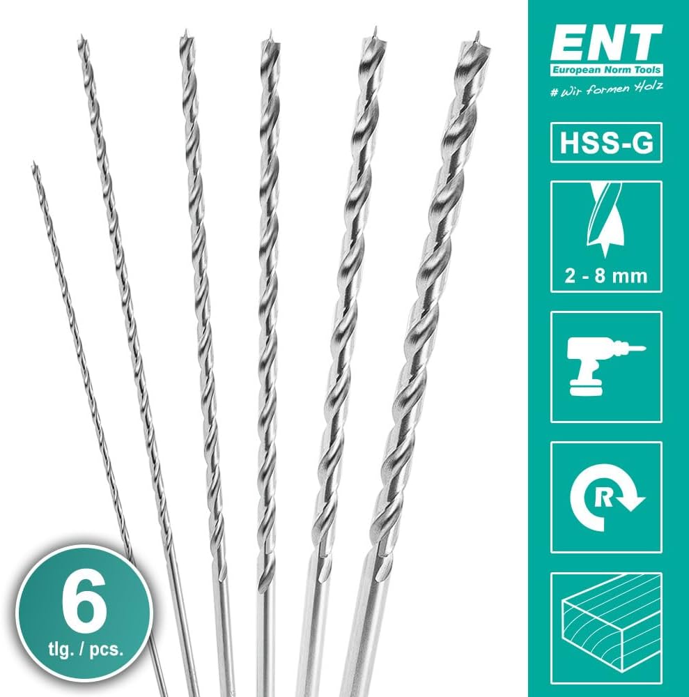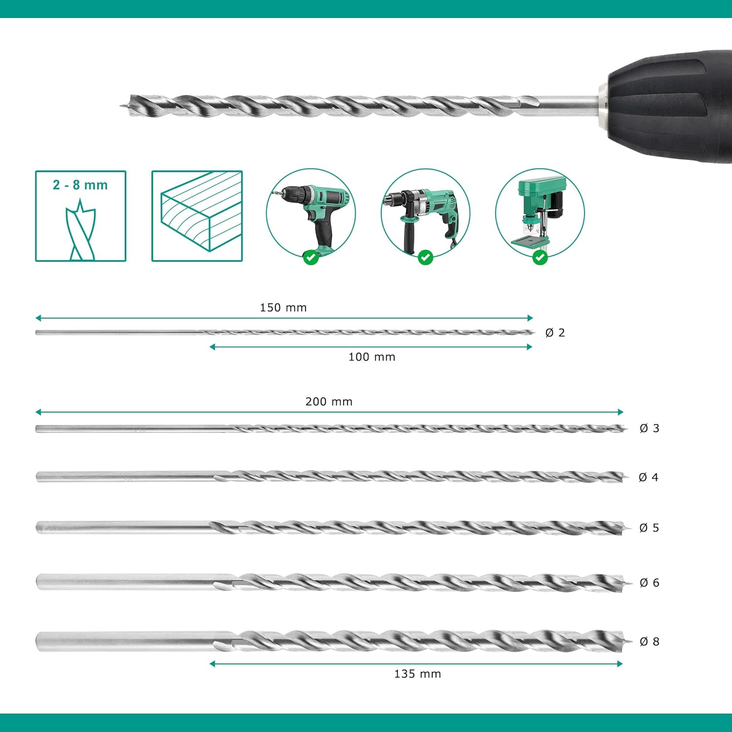 - Dieses Holzbohrer-Set enthält 6 Holzbohrer in langer Ausführung und den Durchmessern 2, 3, 4, 5, 6 und 8 mm. Die extralange 100/135 mm Nutzlänge und eine maximale Gesamtlänge von 150/200 mm bieten mehr Spielraum, dadurch sind diese Bohrer speziell
