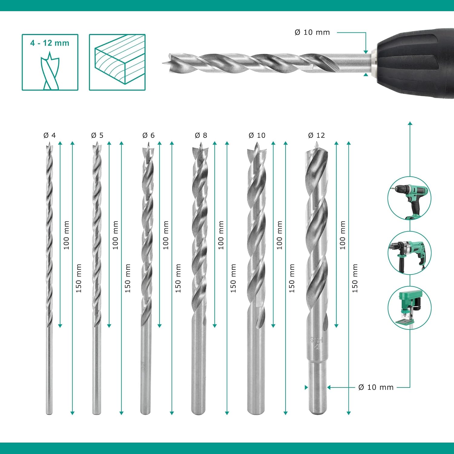 - Dieses Holzbohrer-Set enthält 6 Holzbohrer in langer Ausführung und den Durchmessern 4, 5, 6, 8, 10 und 12 mm. Die 100 mm Nutzlänge und 150 mm Gesamtlänge bieten mehr Spielraum, dadurch sind diese Bohrer speziell für tiefe Bohrlöcher, Sacklöcher