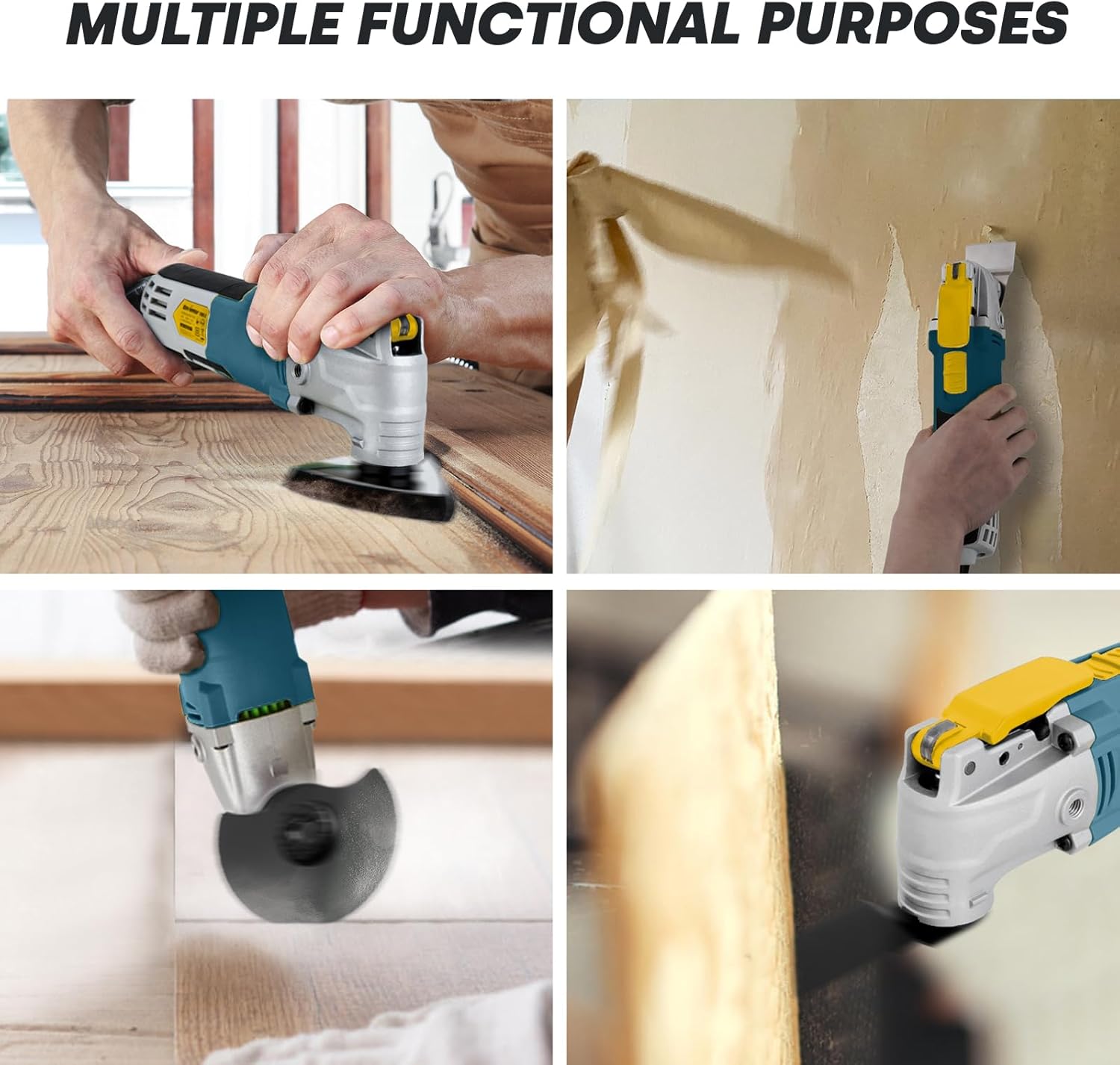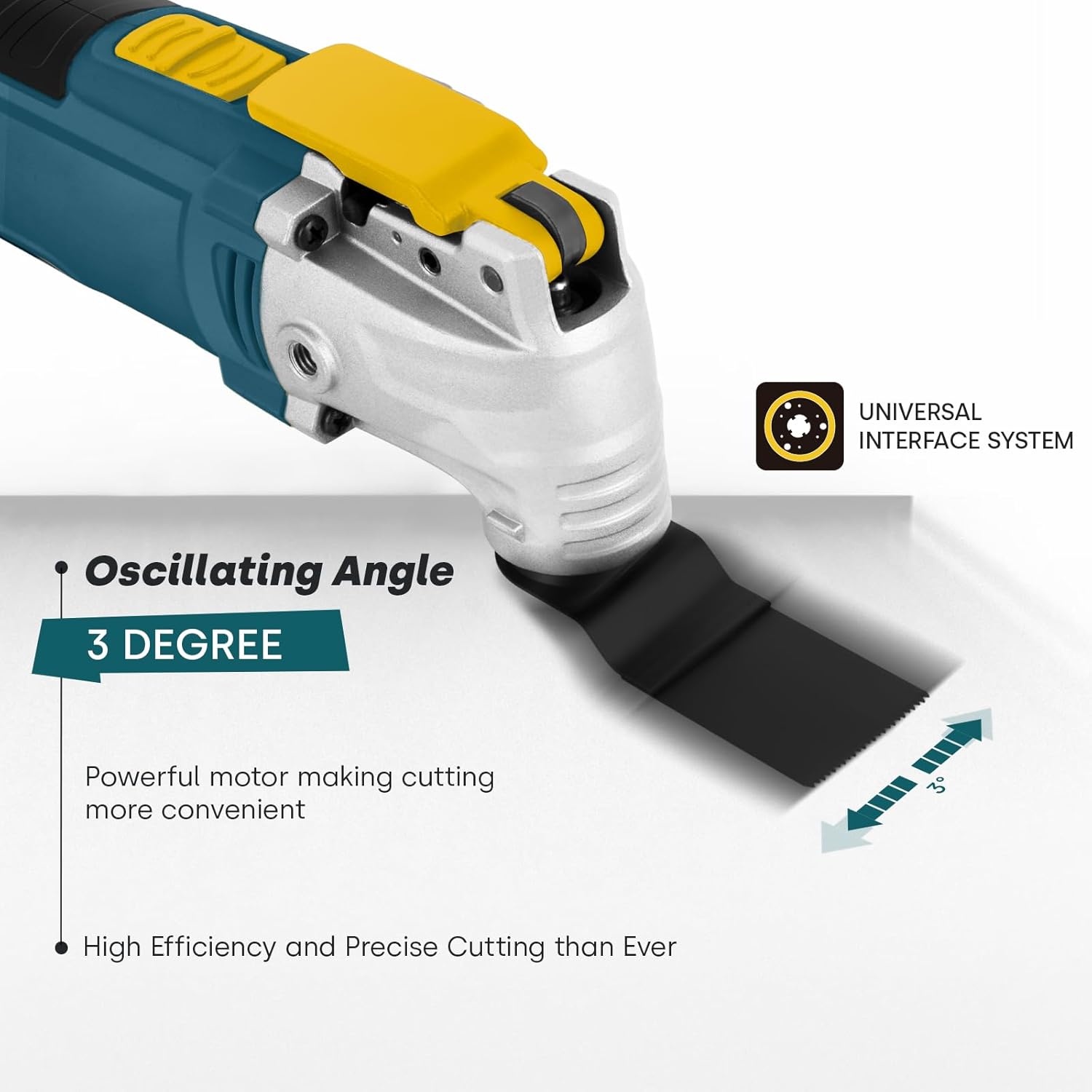 • 【3° Oszillationswinkel】 3˚ Oszillationswinkel Vibrationsschnitt für längere, tiefere Schnitte und mehr Effizienz. Bietet Ihnen optimale Schnittleistung und Komfort. Diese oszillationssäge kann Holz, Rohre, Fliesen, Nägel, Schrauben,