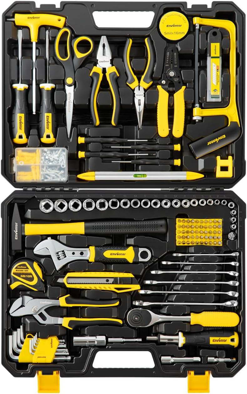- ◕【HOCHWERTIGES HAUSHALTS WERKZEUGSET】 Das Enventor-Werkzeugkoffer ist aus hochwertigem Stahl gefertigt und wärmebehandelt und verchromt. Die Stahlkonstruktion sorgt für Stabilität und Haltbarkeit, während die Chromoberfläche die Ästhetik