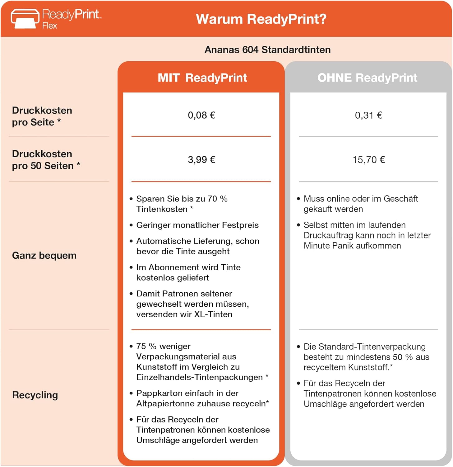 - ReadyPrint Flex: flexible Tintentarife ab 0,99 € pro Monat; Tinte wird nach Hause geliefert, noch bevor sie zur Neige geht; monatlich kündbar