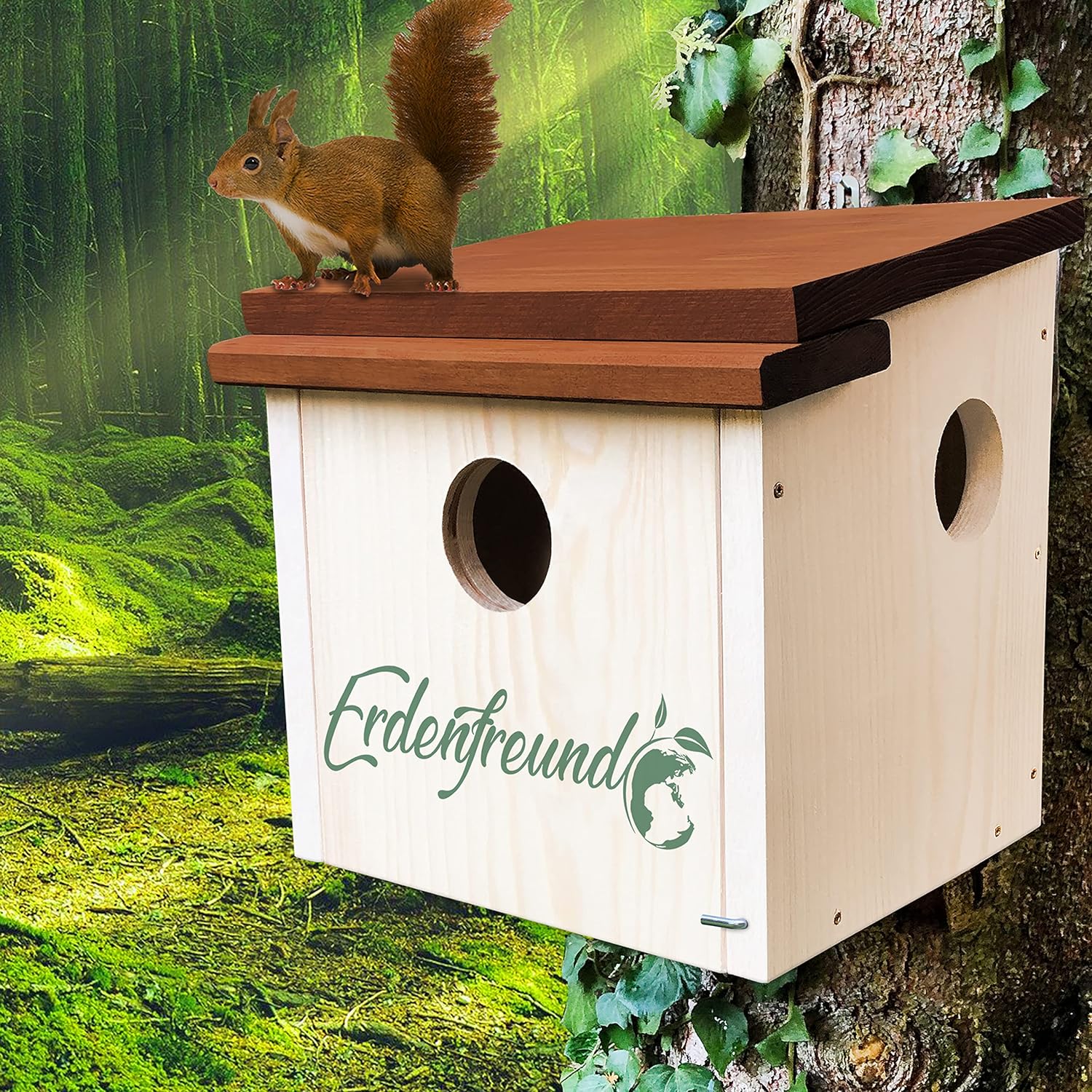 - 🐾TIERFREUNDLICH: Das naturbelassene Holz stammt direkt aus pfälzischen Wäldern in denen Eichhörnchen leben und gibt ihnen ein vertrautes Gefühl. Unser Eichhörnchenhaus besitzt extra 3 Eingangslöcher die als Fluchtmöglichkeiten dienen, sobald sich Fressfeinde nähern. Die Erdenfreund Tierhäuser haben keine scharfen Kanten oder spitze Ecken. Wir lieben Tiere, Nachkontrolle ist uns eine Herzensangelegenheit!