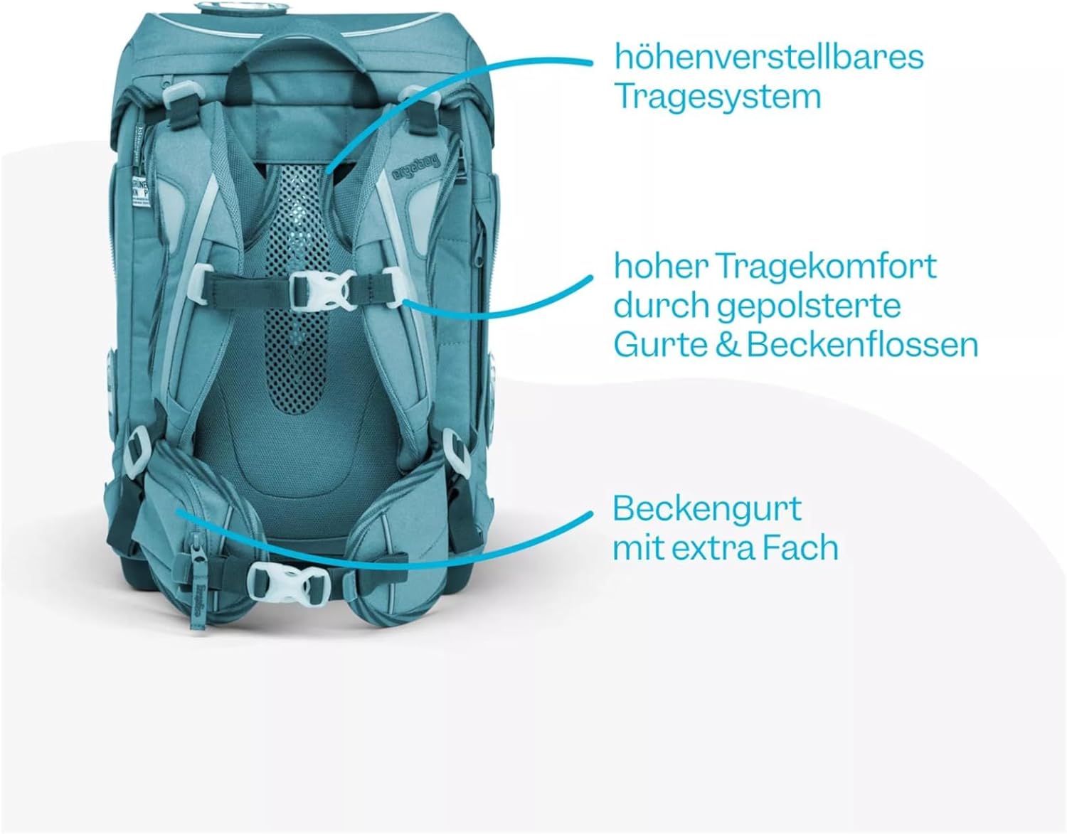 - Ergonomisch – Passt sich dank höhenverstellbarem Tragesystem individuell an Körpergrössen an und ist für kleine und grosse Schulkinder geeignet. Die breiten, gepolsterten Beckenflossen verteilen das Gewicht auf die Hüfte und sorgen für hohen