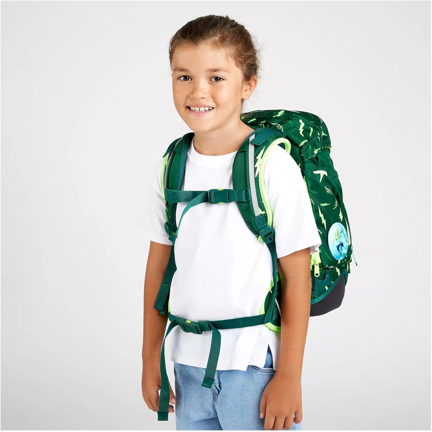 - Ergonomisch – Der Schulrucksack passt sich durch das höhenverstellbare Tragesystem an die individuelle Köpergrösse an. Die gepolsterten Beckenflossen verteilen das Gewicht gleichmässig.