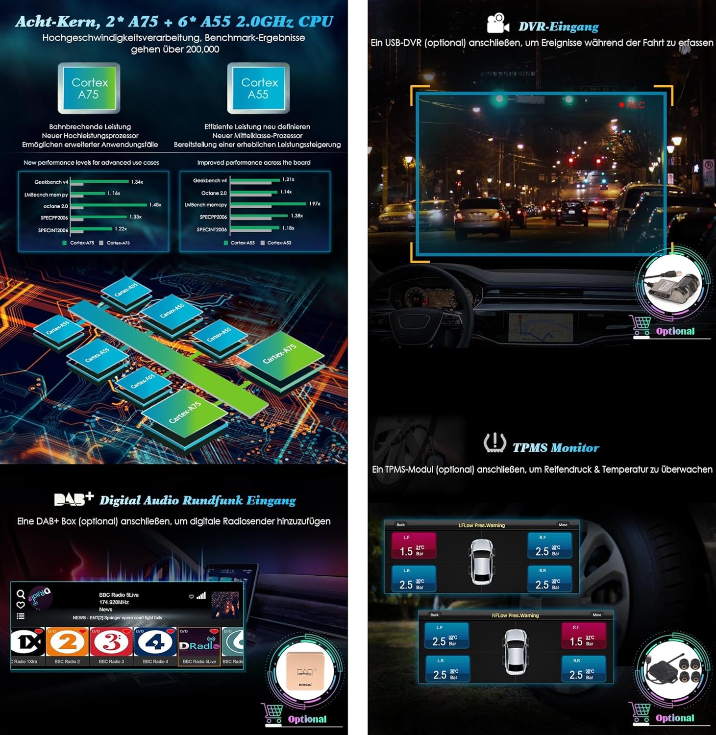 - đăErweiterte Android SystemfunktionenăEingebautes DSP-System, 16-Band-EQ-Auswahl, Bass / Surround einstellbar, die den perfekten Sound-Effekt zu Ihrem Auto bringen. Eingebautes Dualband-WLAN fĂŒr das Internet, unterstĂŒtzt 2,4-GHz- und