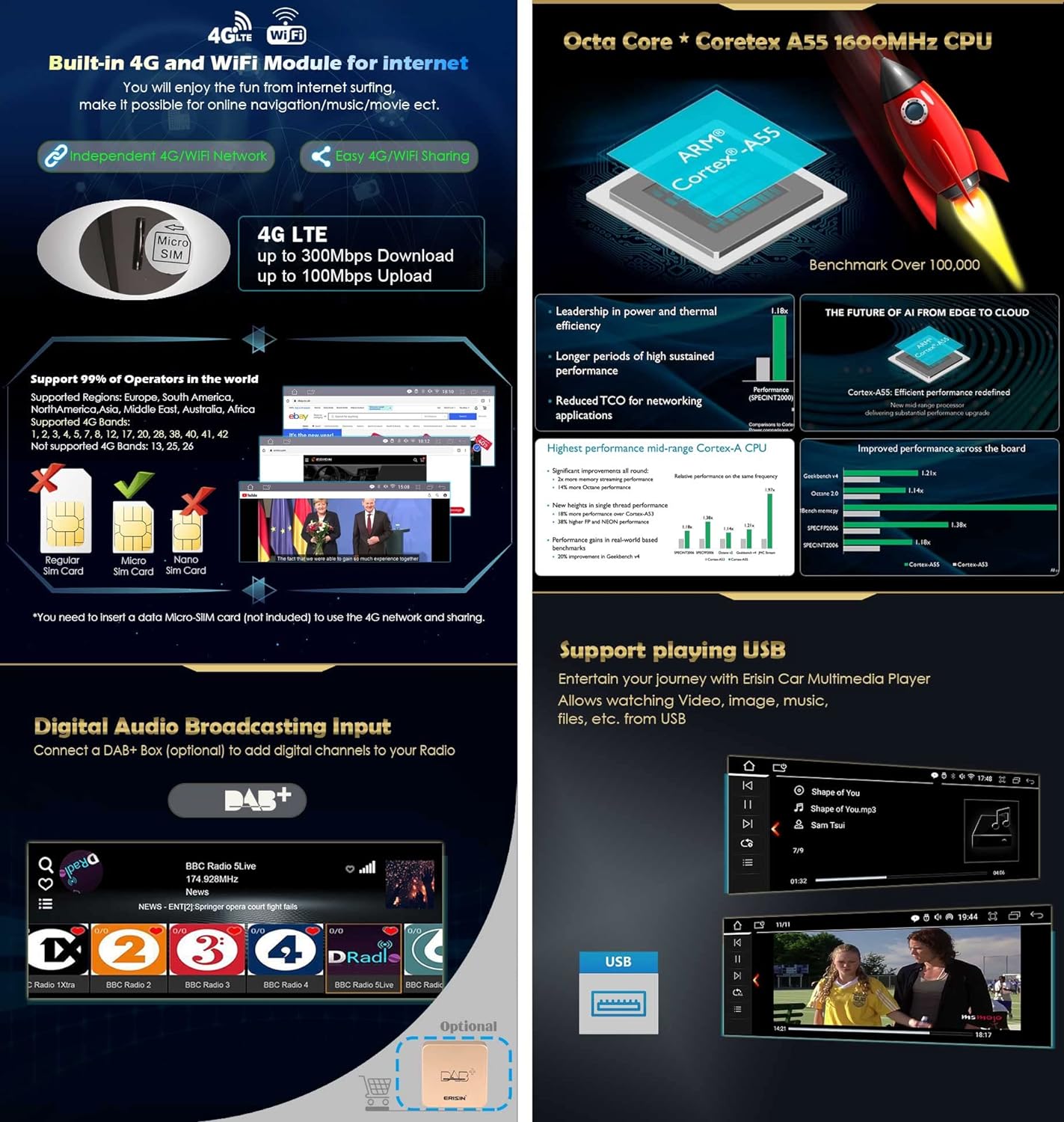 • ✪【Kabelgebundenes & Kabelloses CarPlay / Android Auto & DSP】Integrierter CarPlay / Android Auto Chip integriert. Benutzer können damit telefonieren und Musik hören. Es ist nicht erforderlich, einen anderen Adapter zu verwenden. Die