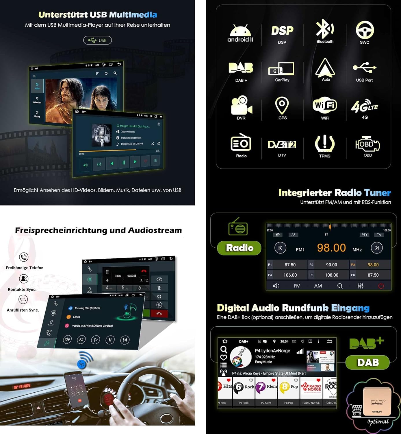 - 🚀【Grosse Auswahl an Funktionen】Dieses Android Autoradio unterstützt USB, SD, AM/FM-Radio, RDS, DAB+, DVB-T2, TPMS, OBD2, DVR, Rückfahrkameraeingang usw. Unterstützt Split Screen Ansicht, Sie können zwei Apps nebeneinander ausführen.