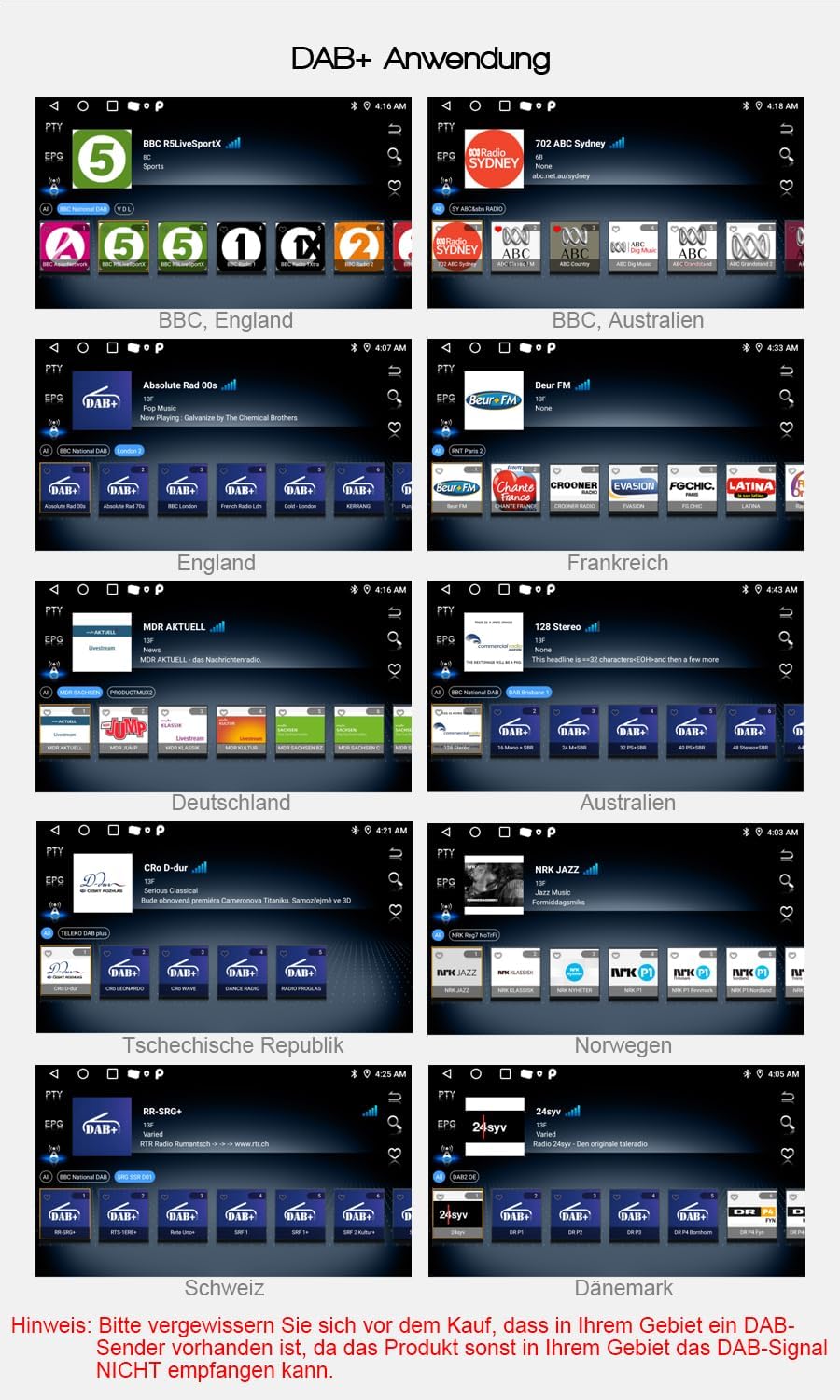 - ▲ Der neue Radiostandard DAB: Digital Audio Broadcasting ermöglicht Ihnen überregionale Musik mit Ihren lokalen bekannten und auch neuen Sendern. CD-Klangqualität und Rauschfreiheit bei hervorragender Übertragung machen DAB-Radio zu einem besonderen Erlebnis im Fahrzeug. DAB+ (Digital Audio Broadcasting) hat nach und nach den traditionellen analogen Roadcast AM/FM abgelöst. Ständiger Programmzuwachs und Ausbau des Sendergebiets machen DAB schon bald für fast ganz Europa zugänglich.