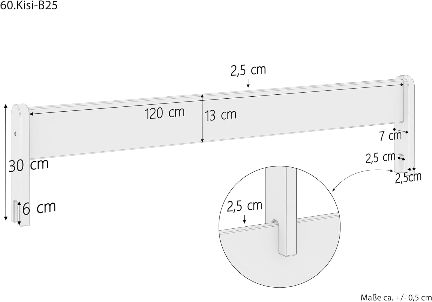 - Masse ca. 30 cm hoch und ca. 125 cm lang. Kerbe zum Aufstecken ca. 2,5 cm breit. Rausfallschutz als Bettgitter zum einfachen Aufstecken auf den Bettrahmen