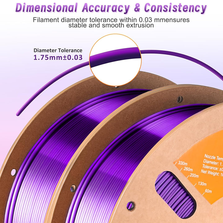 - 【High Accuracy Silk Filament】Der Durchmesser des doppelten Seidenfilaments ist 1,75 mm mit einer Toleranz von +/- 0,03 mm. Dichromatic PLA Filament feed smoothly and constantly without clogging the nozzle or extruder making you a smoothly printing &