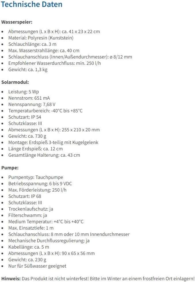 - ✅ FUNKTIONELL | Stufenlos regelbarer Durchflussregler an der Wasserpumpe. Teichpumpe mit Trockenlauf- und Überlastschutz, auswaschbarer Filter-Einsatz. Schlauchlänge von Dekofigur zur Gartenteichpumpe 3m. Dekorativer Brunnen. Wetterfest.