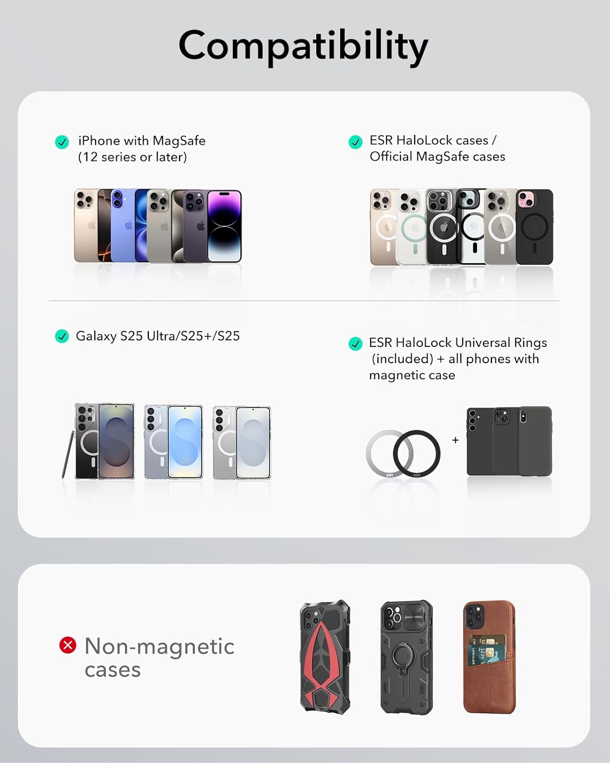 - Ultrastarke Magnete: Hochwertige N52H Magnete mit einer Haltekraft von 2.300 g halten dein Handy sicher an Ort und Stelle; kombinierbar mit ESR HaloLock Hülle für den stärksten Magnetverschluss; kabelloses Laden wird nicht unterstützt