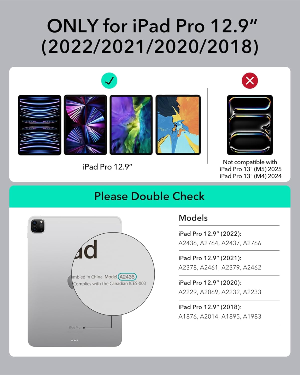 - Compatibility: only compatible with iPad Pro 12.9ʺ (6th Generation, 2022), iPad Pro 12.9ʺ (5th Generation, 2021), iPad Pro 12.9ʺ (4th Generation, 2020), and iPad Pro 12.9ʺ (3rd Generation, 2018); models A2436, A2764, A2437, A2766, A2378, A2461,
