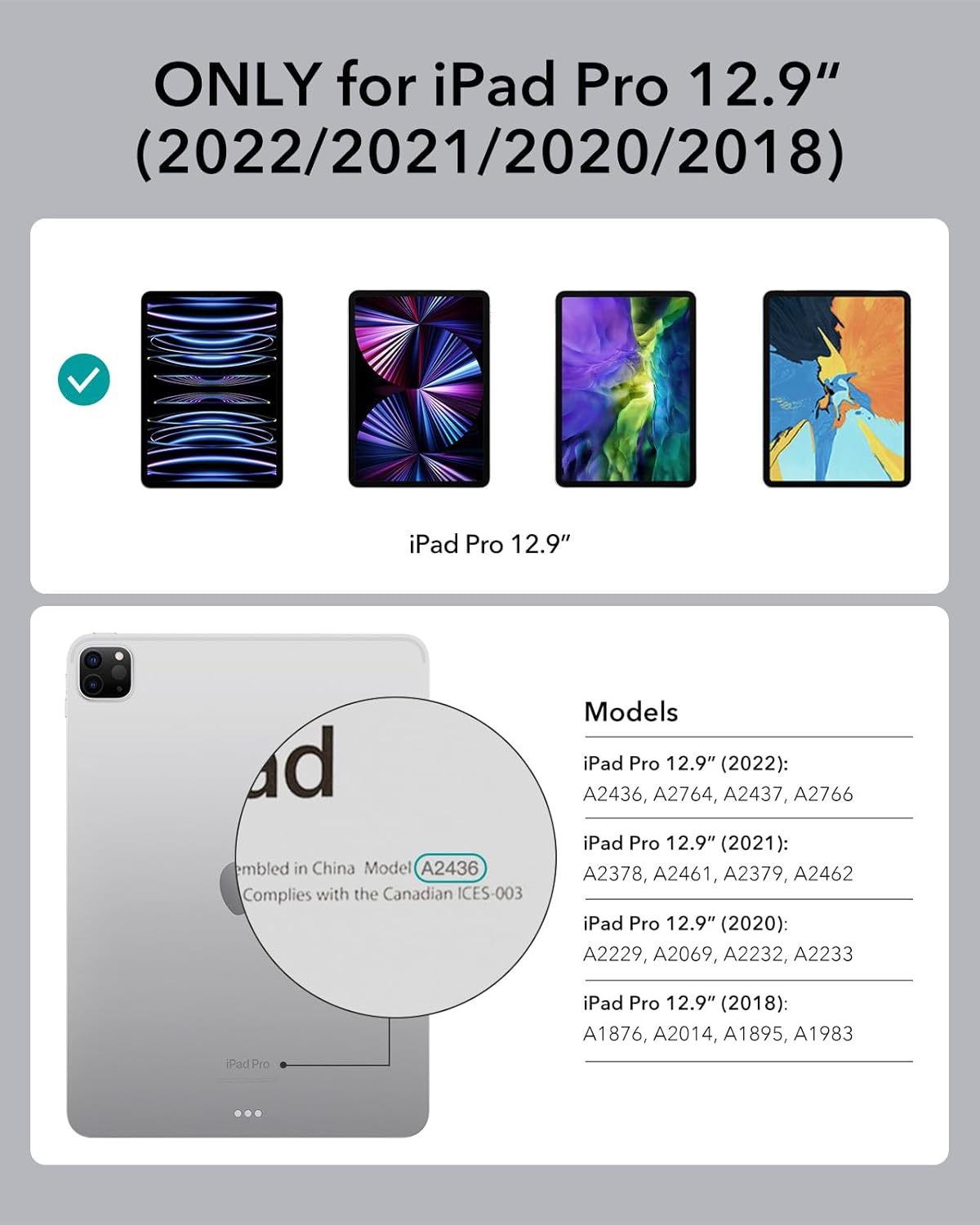 • Compatibility: only compatible with iPad Pro 12.9ʺ (6th Generation, 2022), iPad Pro 12.9ʺ (5th Generation, 2021), iPad Pro 12.9ʺ (4th Generation, 2020), and iPad Pro 12.9ʺ (3rd Generation, 2018); models A2436, A2764, A2437, A2766, A2378, A2461,