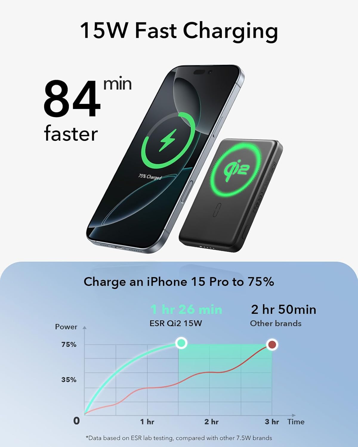 - Lade 2 auf einmal: Lade zwei Geräte gleichzeitig mit kabellosem Qi2 MagSafe Laden und kabelgebundenem USB-C Laden; kabelloses Laden ist nur mit der iPhone 16/15/14/13/12-Serie kompatibel; im Lieferumfang enthalten: Tragbares Qi2 Ladegerät, USB-C auf