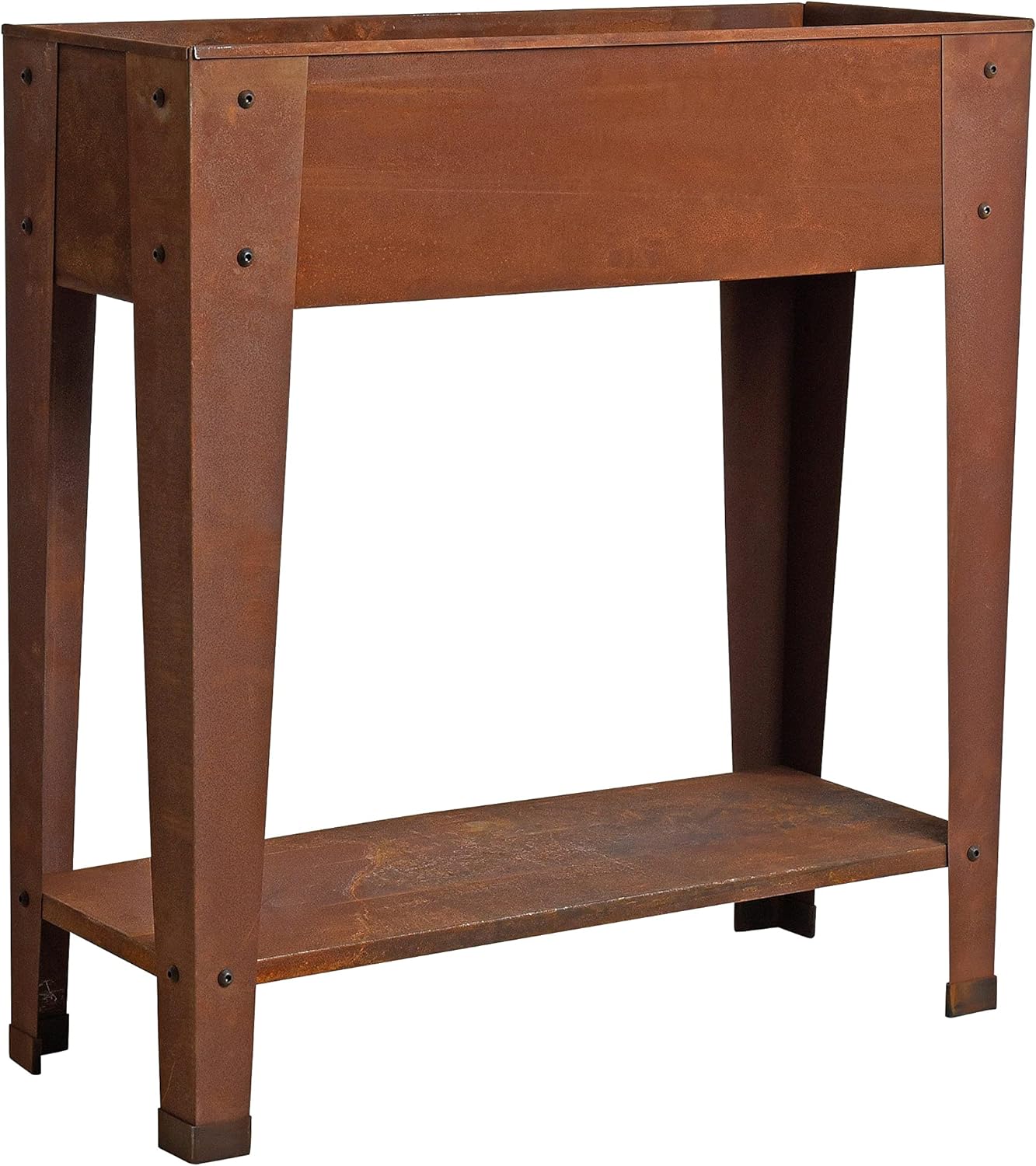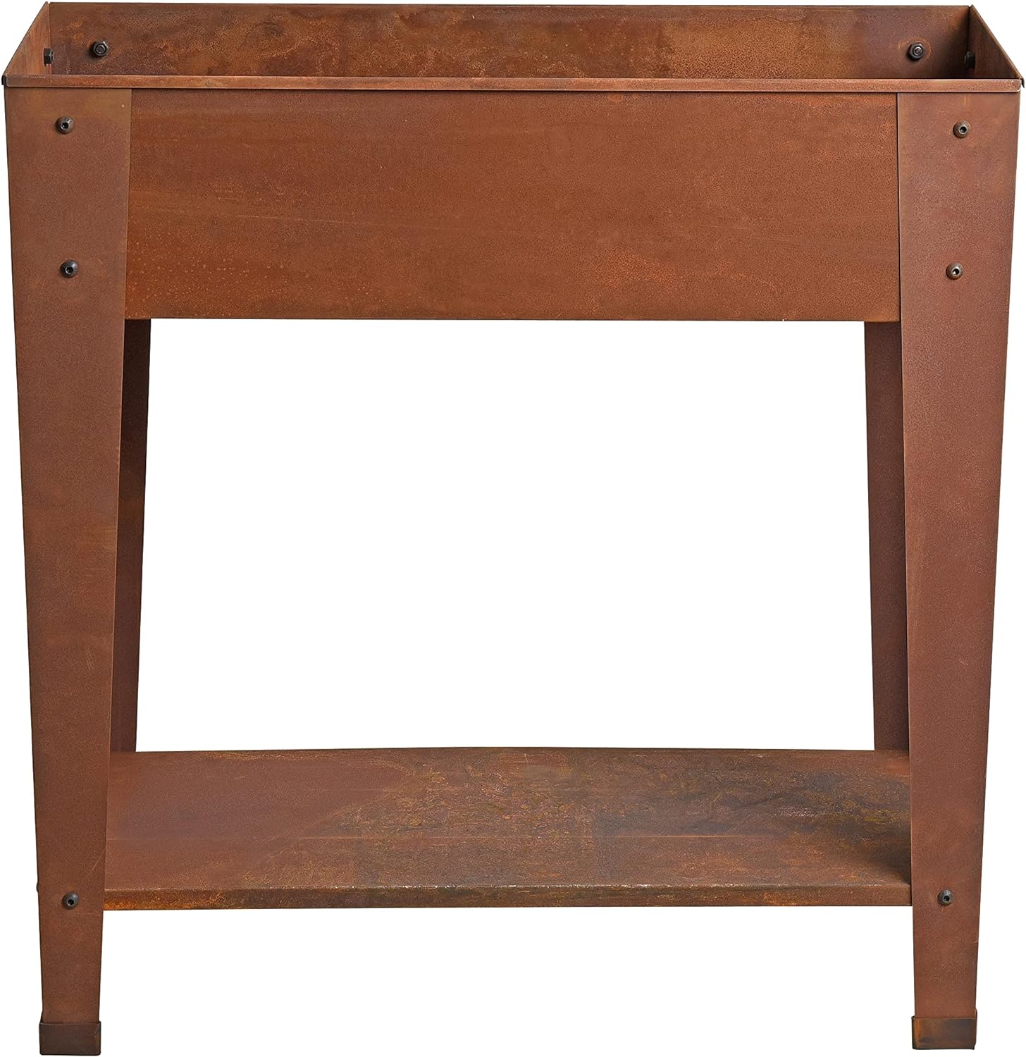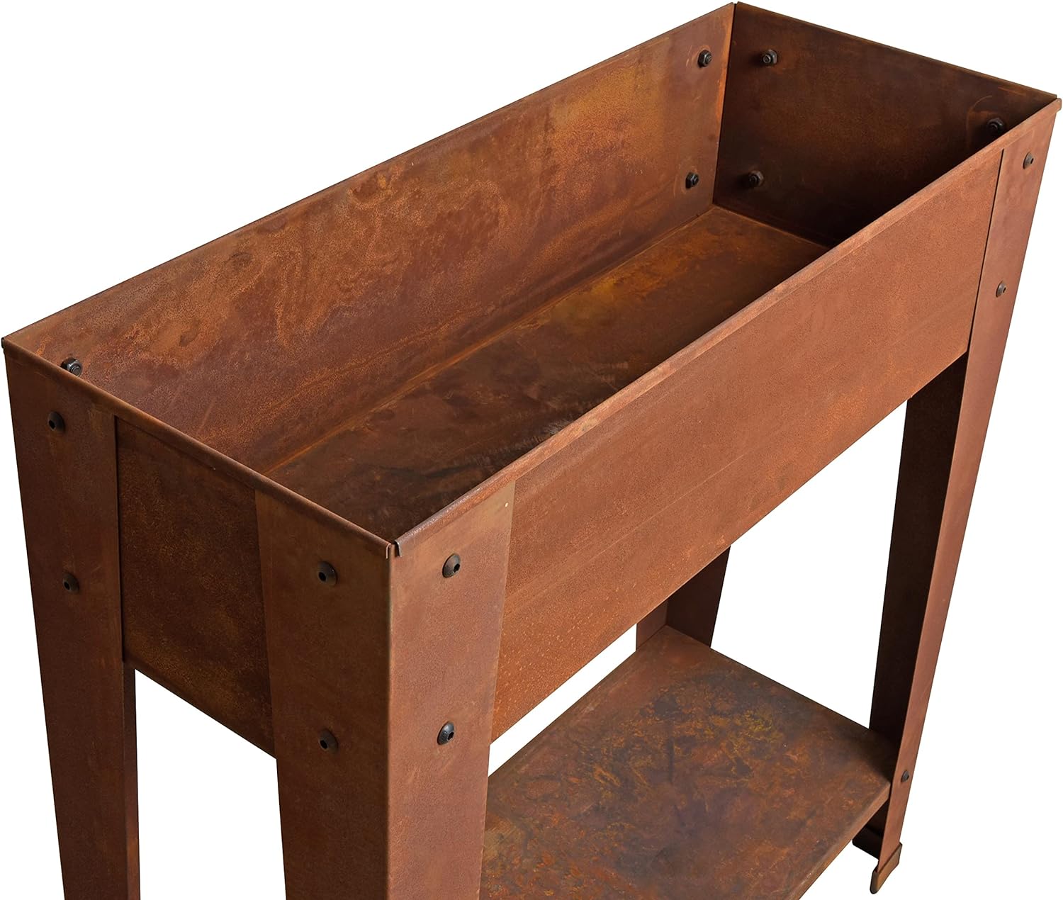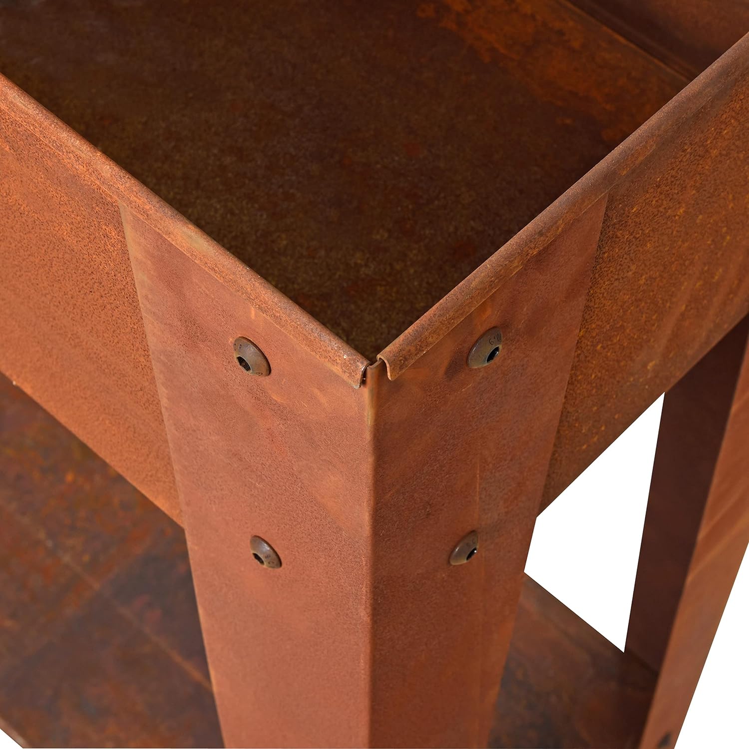 • Edelrost Hochbeet mit komfortabler Ablage und mit Wasser-Ablaufloch in der Mitte des Pflanzkastens