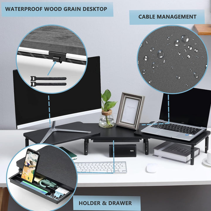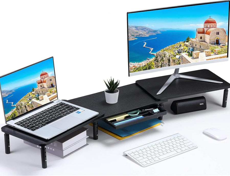 - SPACE STORAGE DRAWER: The monitor stand riser has 1 phone holder, a pen/stationery slot in the middle, and 2 storage compartments for gadgets, tabs and business cards, making it simple to store office supplies and accessories. When not in use, you can