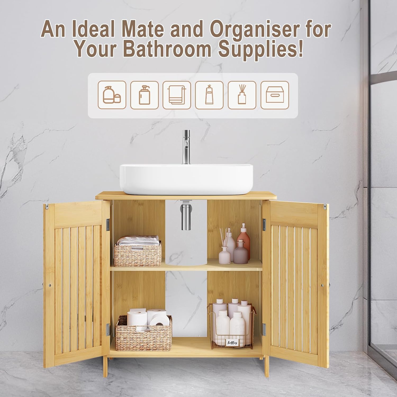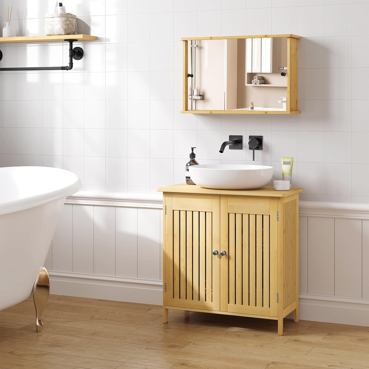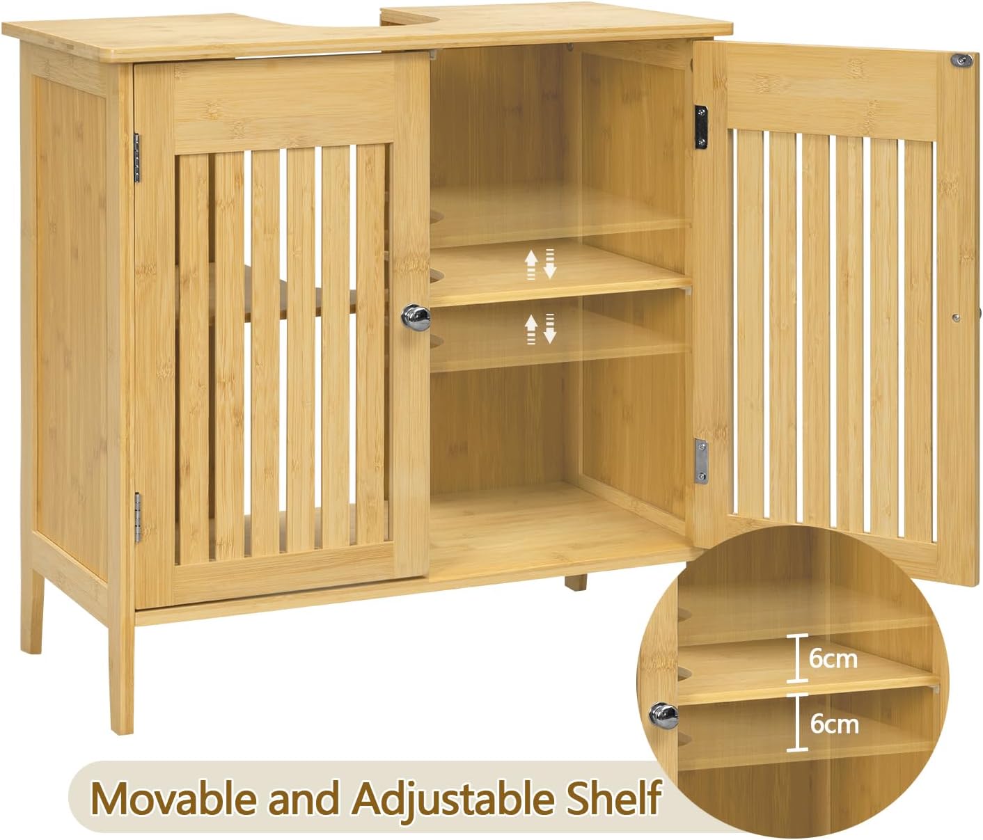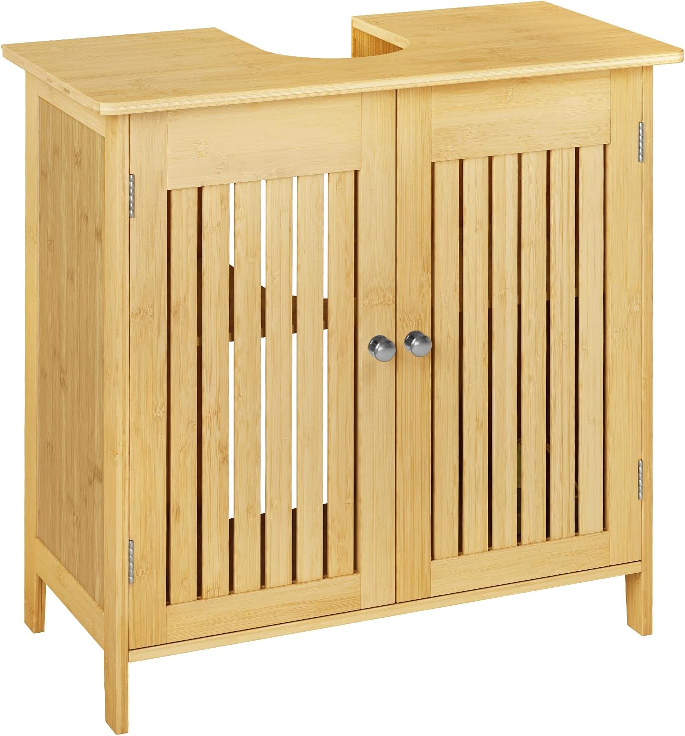 - ✅[Badunterschrank aus natürlichem Bambus]: Der Schrank aus hochwertigem, klar lackiertem Bambus ist abriebfest, feuchtigkeitsbeständig und leicht zu reinigen. Die robusten Türen mit Metallscharnieren und -griffen lassen sich leicht öffnen und