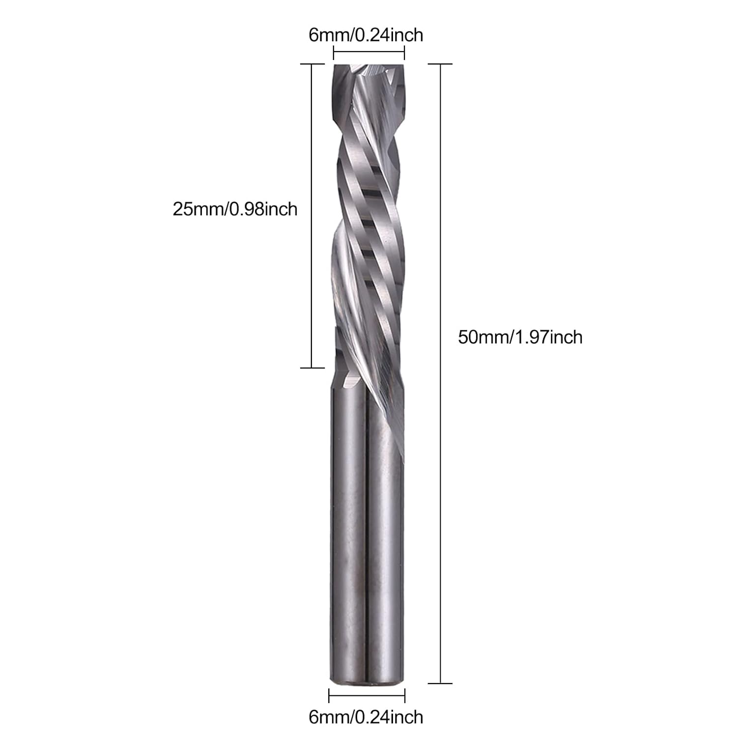 • 【Allgemeine Informationen】Up Down Cut, 6mm Schaft x 6mm Schneiddurchmesser, 25 mm (1 Zoll) Nutlänge mit 2 Spiralnuten, Gesamtlänge 50mm (2 Zoll), 5 Stück pro Packung