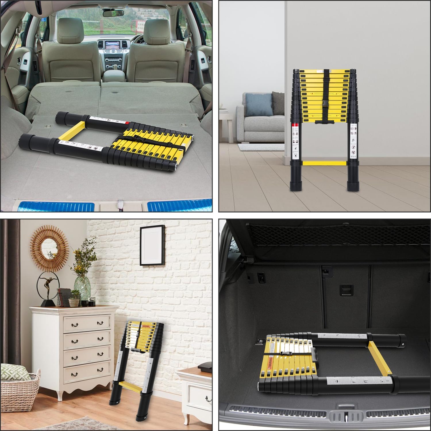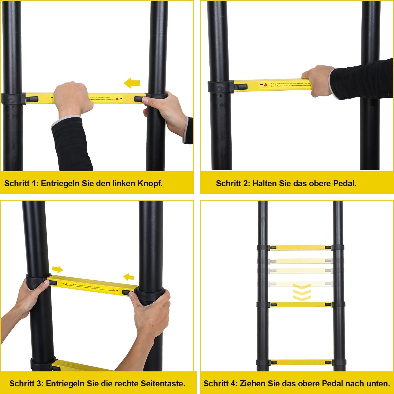 - đăHochwertige MaterialienăDie einziehbare Leiter ist aus einer hochwertigen, korrosionsbestĂ€ndigen Aluminiumlegierung gefertigt, die stark und sicher ist. Das leichte Aluminium ermöglicht es Ihnen, die Leiter auf ein Viertel ihrer