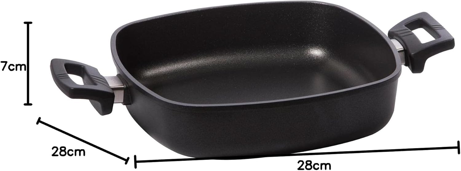• Die grosse flache Kasserolle 28 x 28 cm "Made in Germany" ist mit einem 7 cm hohen Schüttrand ausgestattet und besteht aus bis 240°C hitzebeständigen Aluguss mit abriebfester Antihaftbeschichtung