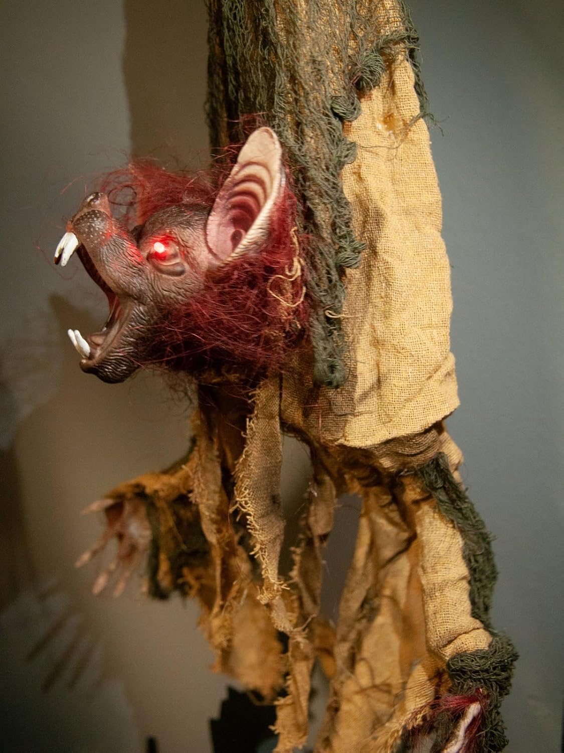 - Halloween Dekoration Fledermaus, animiert Hängefigur .Fledermaus mit Skeletthänden.Arme formbar.Bewegt die Arme und den Kopf.Kopf aus Kunststoff, Torso aus Stoff.
