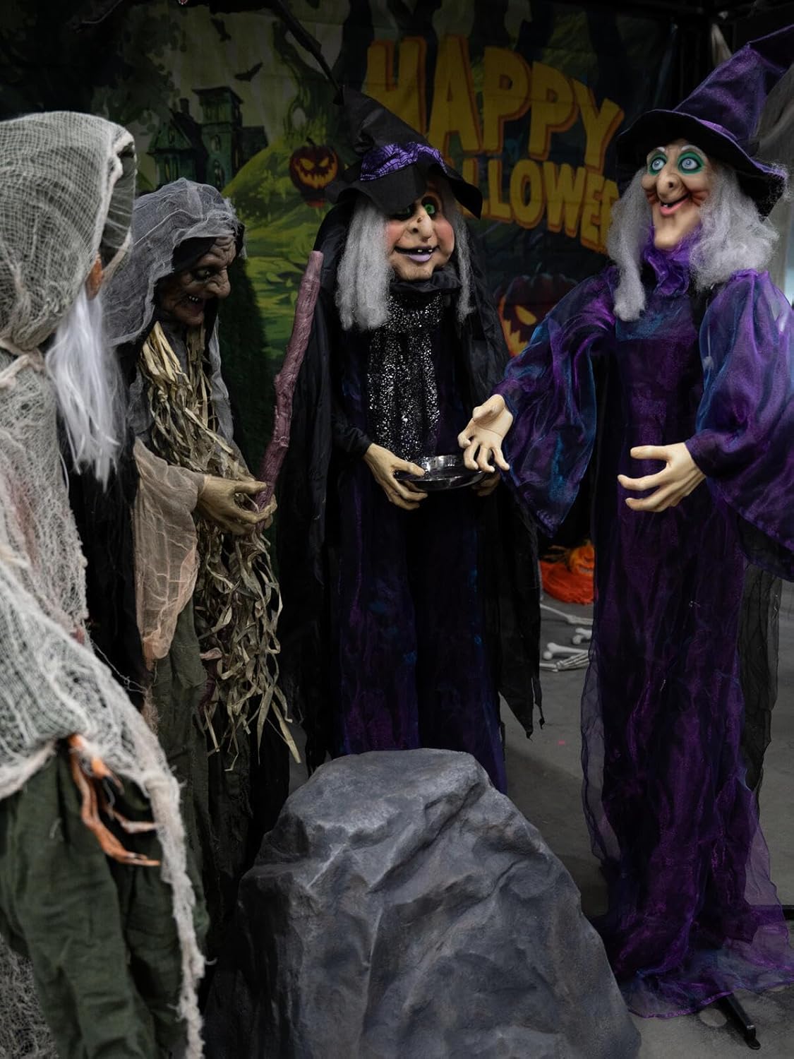 - Stehende Figur Hexe, animiert Hexe mit Bewegungsmotor Bewegt den Kopf Zum Hängen oder Aufstellen.Mit stabilem Standfuss.Arme formbar.Kopf aus Schaummaterial, Torso aus verschiedenen Stoffen.