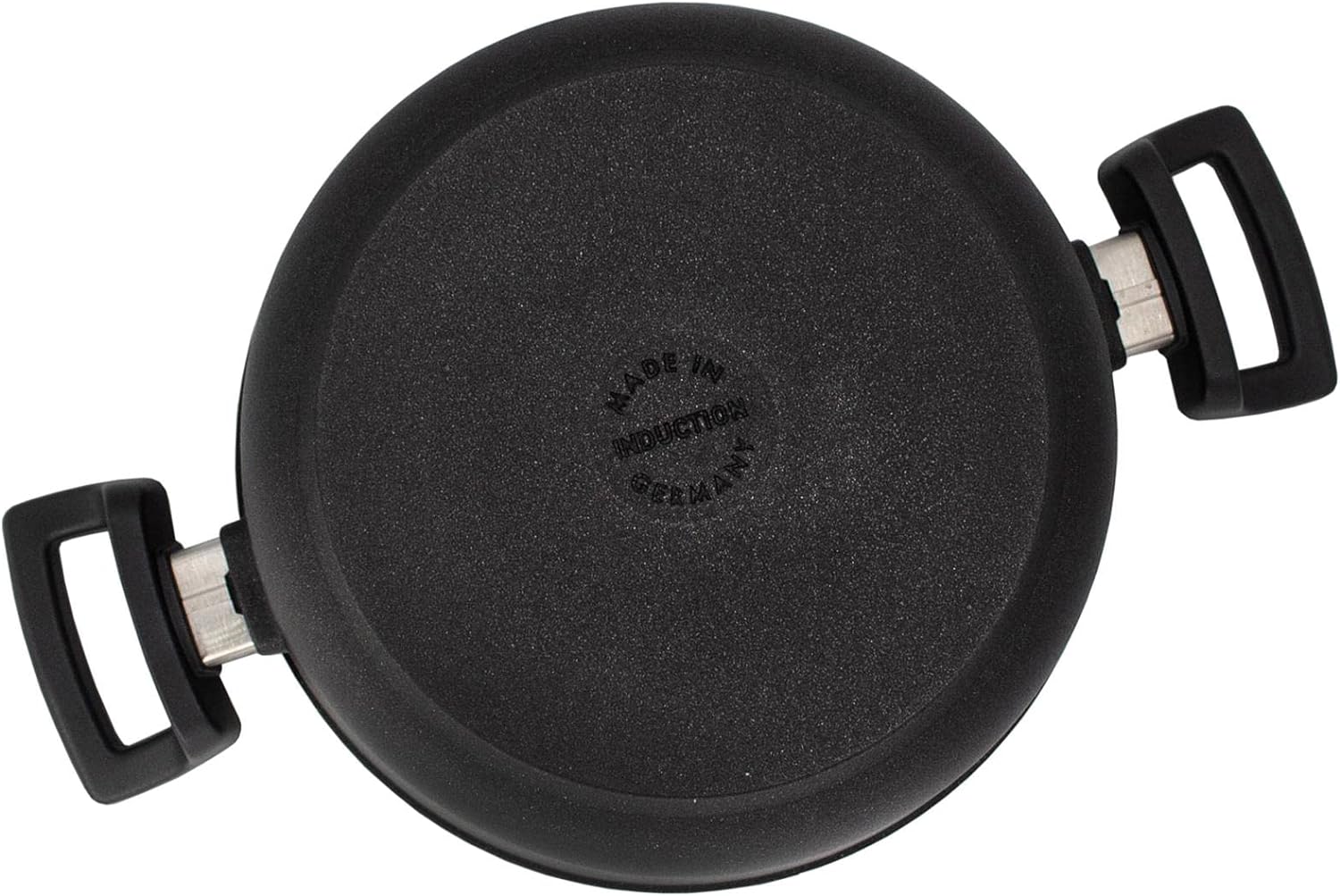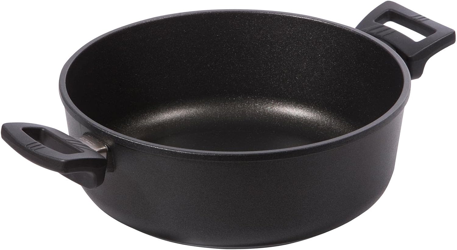 - Der kleine flache Bratentopf Ø 24 cm ist "Made in Germany" und mit einem 10 cm hohen Schüttrand ausgestattet und besteht aus bis 240°C hitzebeständigen Aluguss mit abriebfester Antihaftbeschichtung