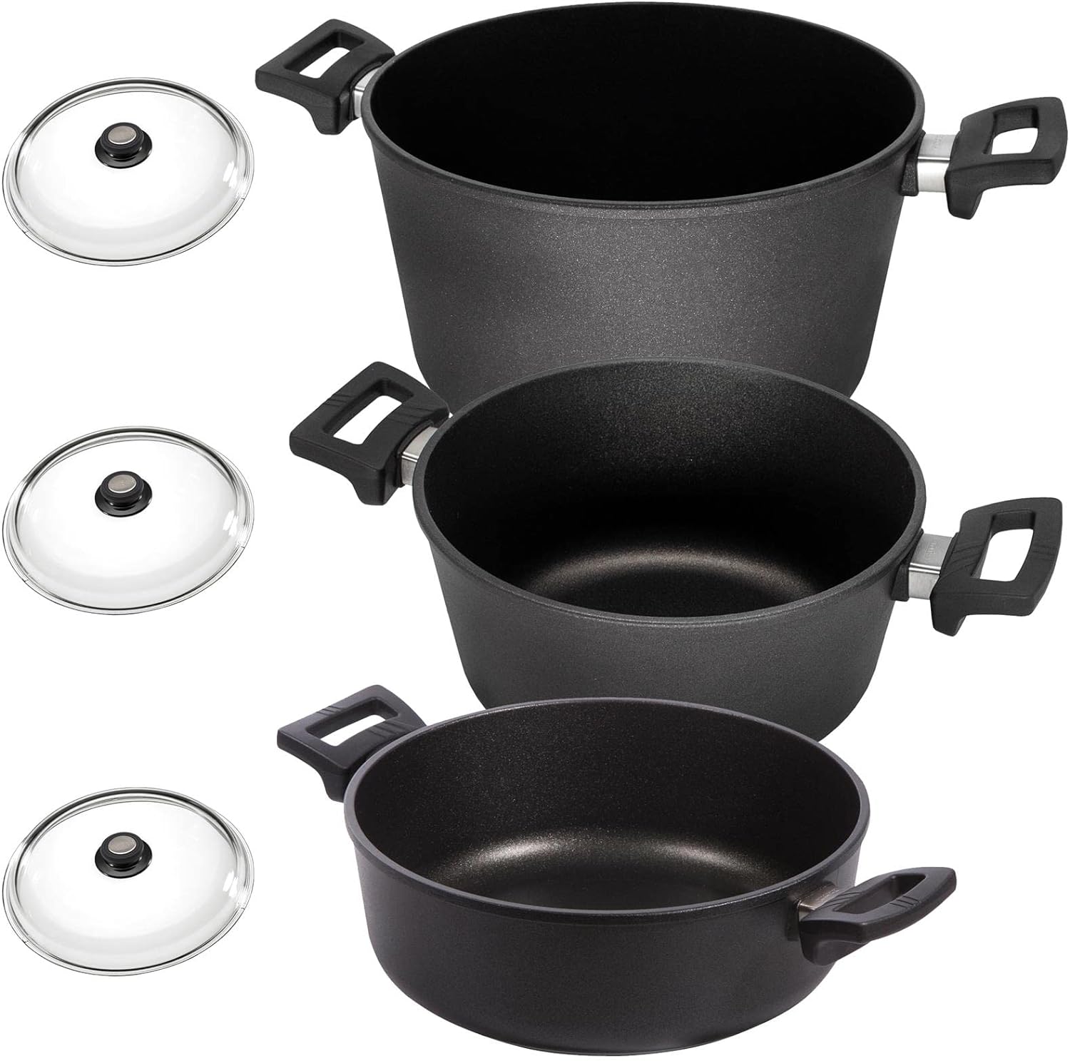 - Das grosse induktive 6-teilige Aluguss-Topfset Made in Germany bietet für die Zubereitung von Speisen 3 Guss-Küchentöpfe mit Glas-Deckel für mehr Flexibilität beim Kochen für die Familie