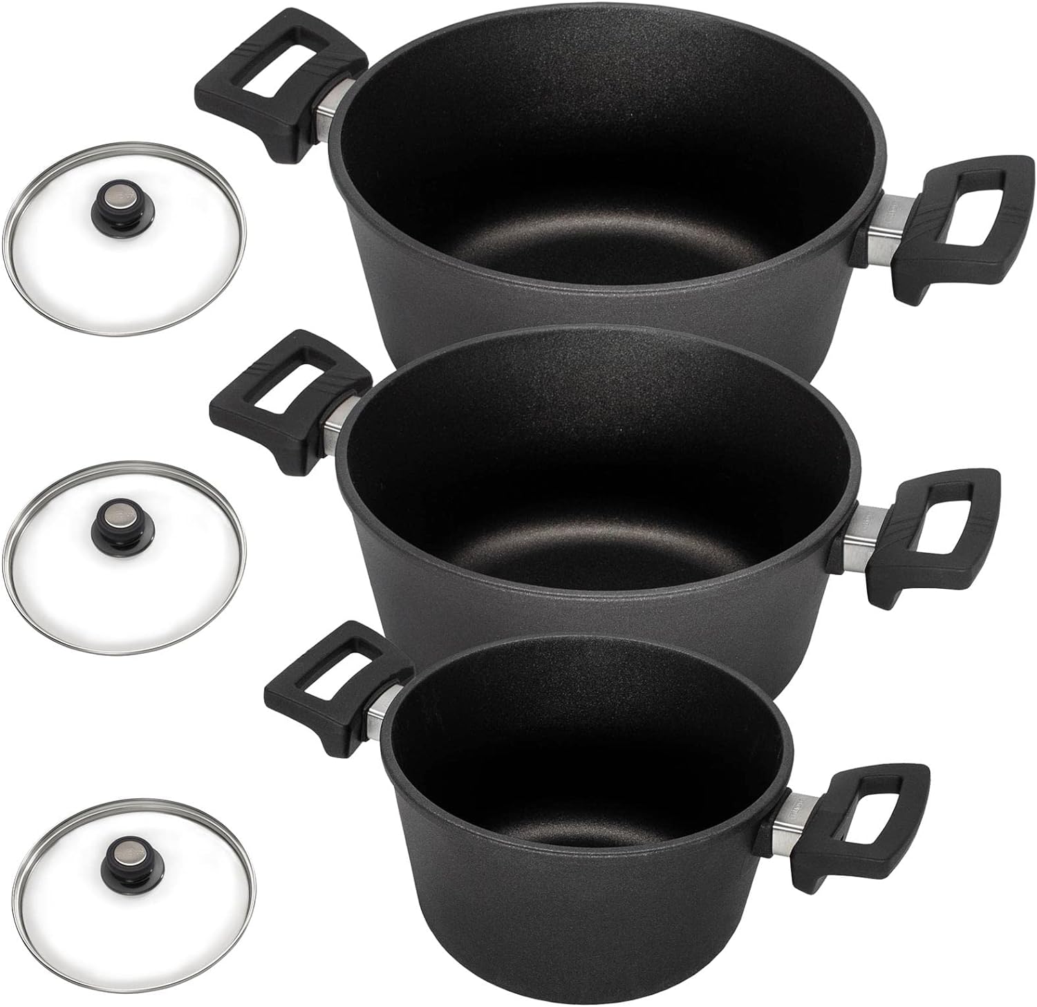 - Das grosse induktive 6-teilige Aluguss-Topfset Made in Germany bietet für die Zubereitung von Speisen 3 Guss-Küchentöpfe mit Glas-Deckel für mehr Flexibilität beim Kochen für die Familie