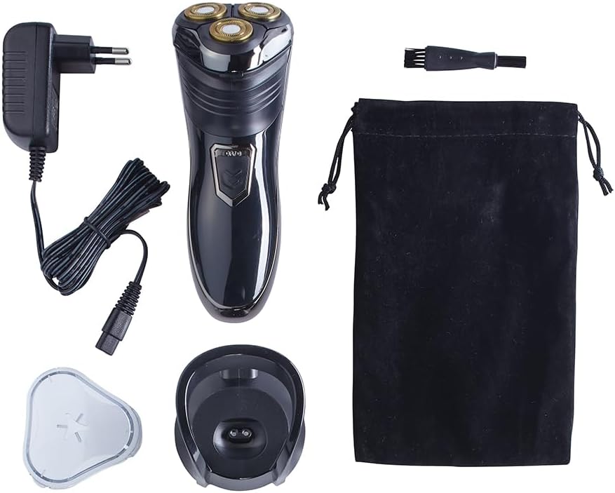 - [ Lieferumfang ] Der Nass- / Trocken-Rasierer mit 3 Scherköpfen und Trimmer hat eine kompakte Grösse von ca. 6 x 16 x 4 cm. Im Set enthalten sind ausserdem 1 x Ladekabel und 1 x Ladestation. Für die Reinigung wird Ihnen in der Packung auch 1 x Bürste