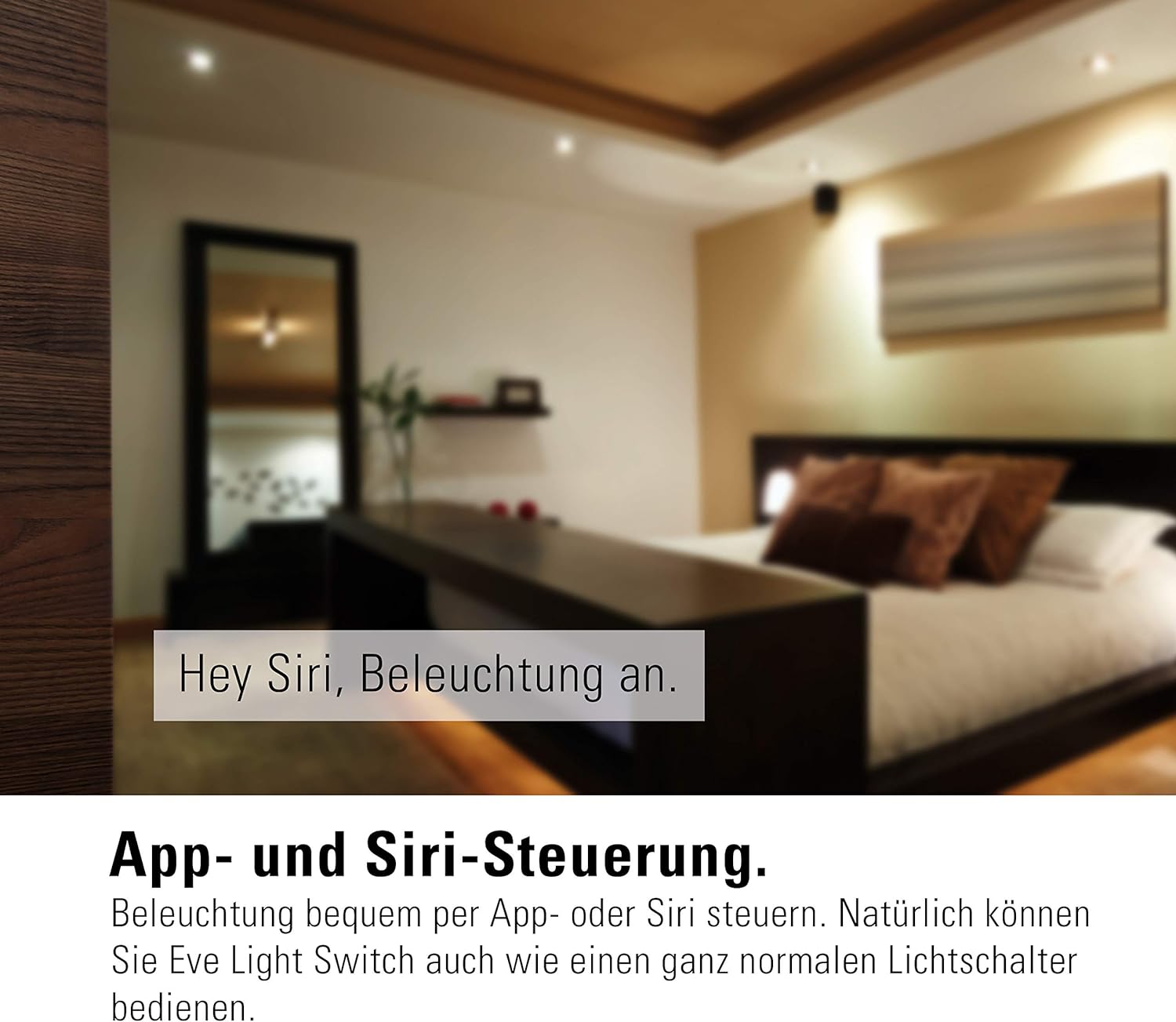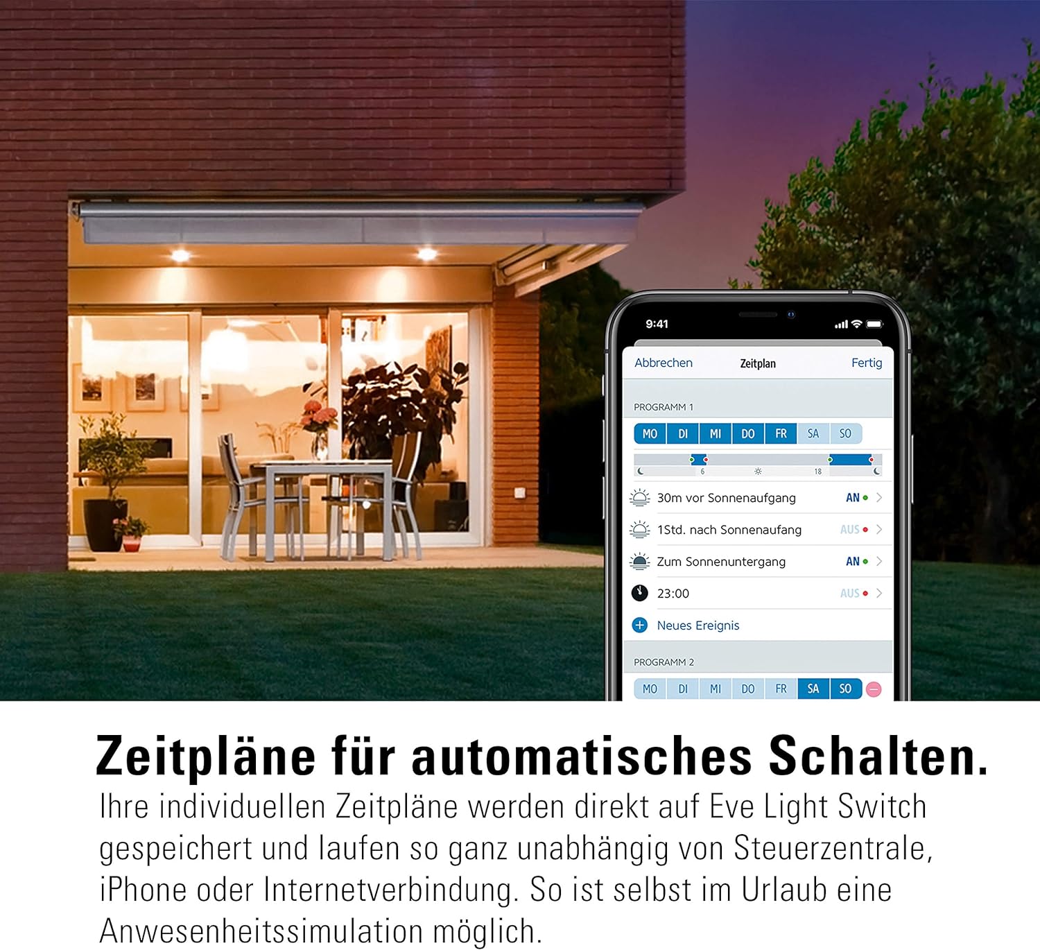 - Zeitpläne auf Eve Light Switch speichern, um die Leuchten unabhängig vom iPhone und Heimnetz automatisch zu schalten. / Über Szenen zeitgleich weitere Apple HomeKit-fähige Geräte schalten, auch von unterwegs oder nach Anwesenheit – dank HomePod,
