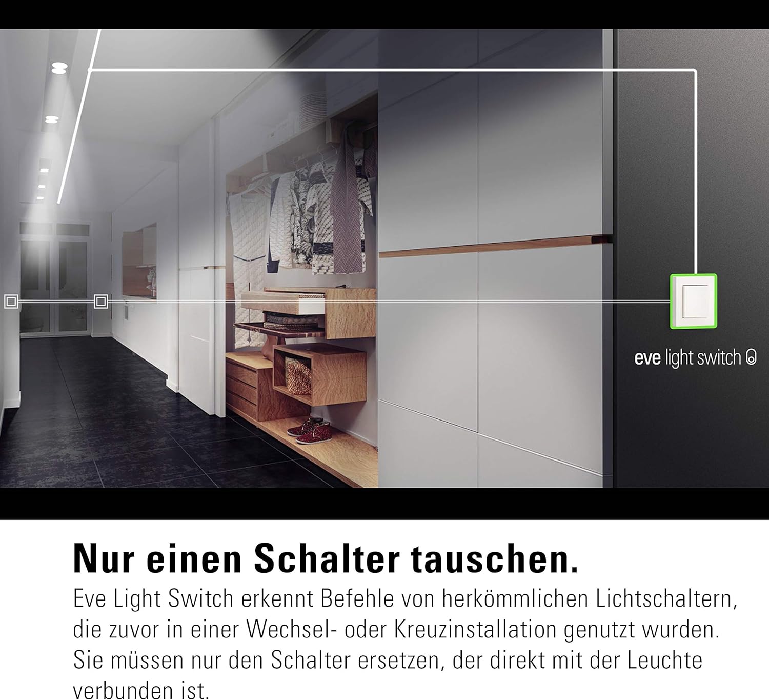 - Für Räume mit einfacher, Wechsel- oder Kreuzschaltung: Der Austausch eines Schalters innerhalb der Lichtschalterkombination reicht aus. / Inklusive 55er-Schalterplatte und -Rahmen / Eve Light Switch und die mitgelieferte Schalterplatte lassen sich bei