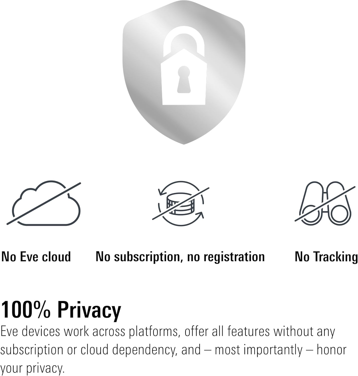- Benötigt eine Steuerzentrale (HomePod oder Apple TV mit tvOS 15) und einen iCloud+-Speicherplan (nicht enthalten). Strengster Datenschutz: keine Eve-Cloud, keine Registrierung und kein Tracking; lokale Prozesse und Kommunikation, ohne Bridge oder Cloud-Abhängigkeit