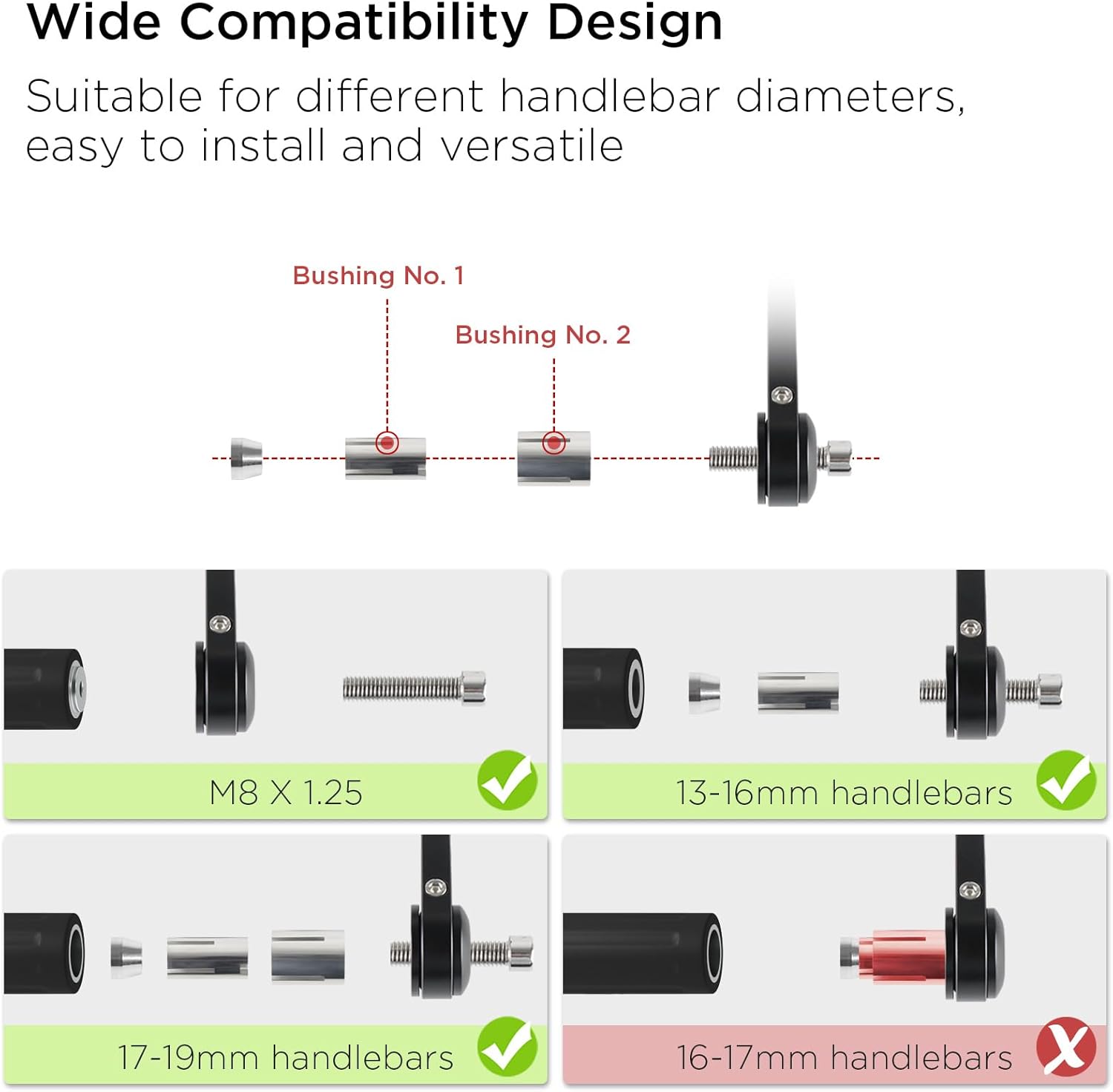 - 【Universelles Design】Lenkerendenspiegel passend für praktisch alle Lenker mit 22mm Aussendurchmesser an den Griffen und Lenkrohr-Innendurchmesser von 13-16mm und 17-19mm. Achtung: ein Innendurchmesser des Griffs zwischen 16-17mm ist nicht geeignet