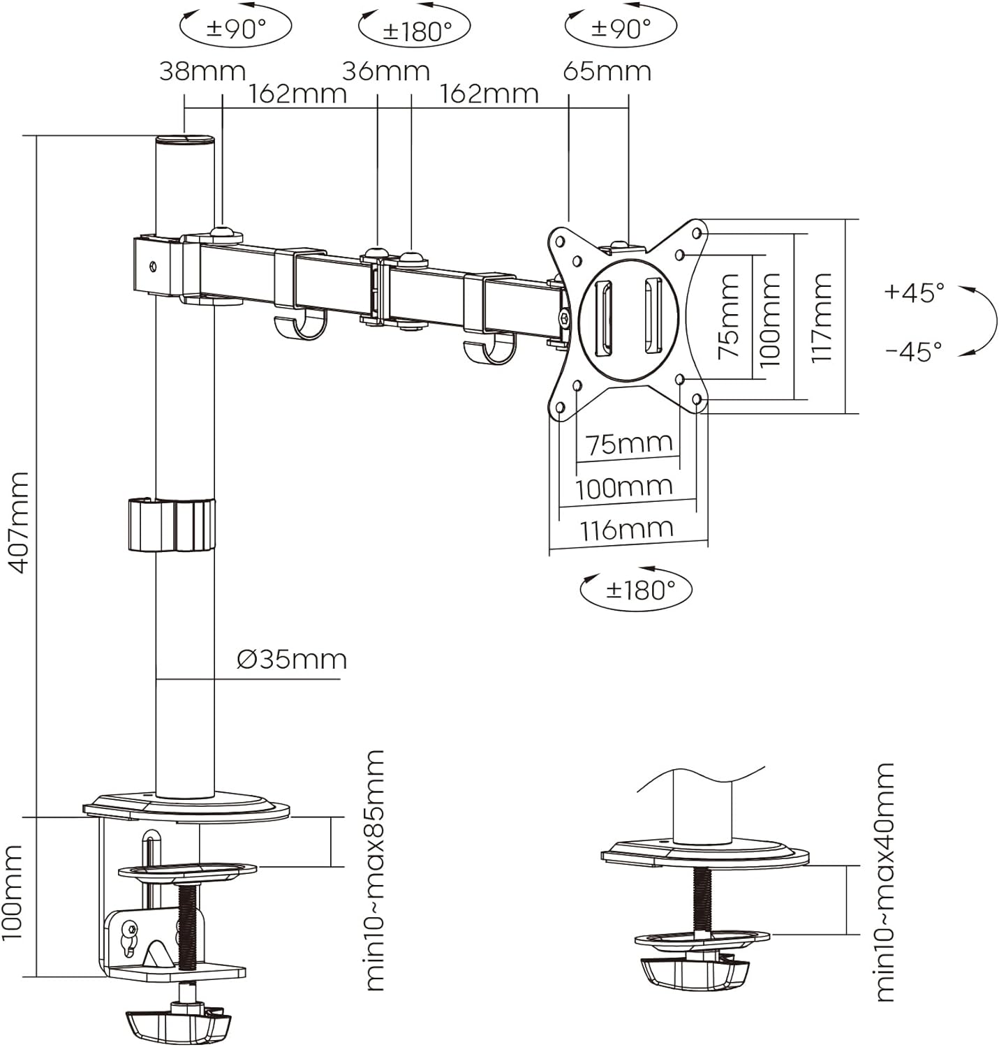 - MONITORHALTERUNG: Robuster, leichter und vielseitiger einarmiger Stahltischständer, geeignet für die Montage eines Monitors bis 27 Zoll und max. 8 kg. VESA 75*75 und 100*100 Befestigungssystem