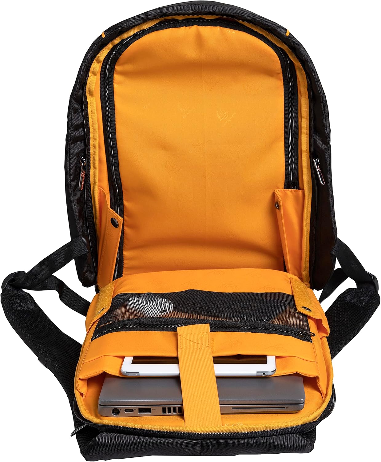 - Hauptfach mit 2 gepolsterten Taschen für Laptop und Tablet. Grosse Vordertasche mit Reissverschluss mit zahlreichen Fächern für Smartphone, Brieftasche, Stifte..